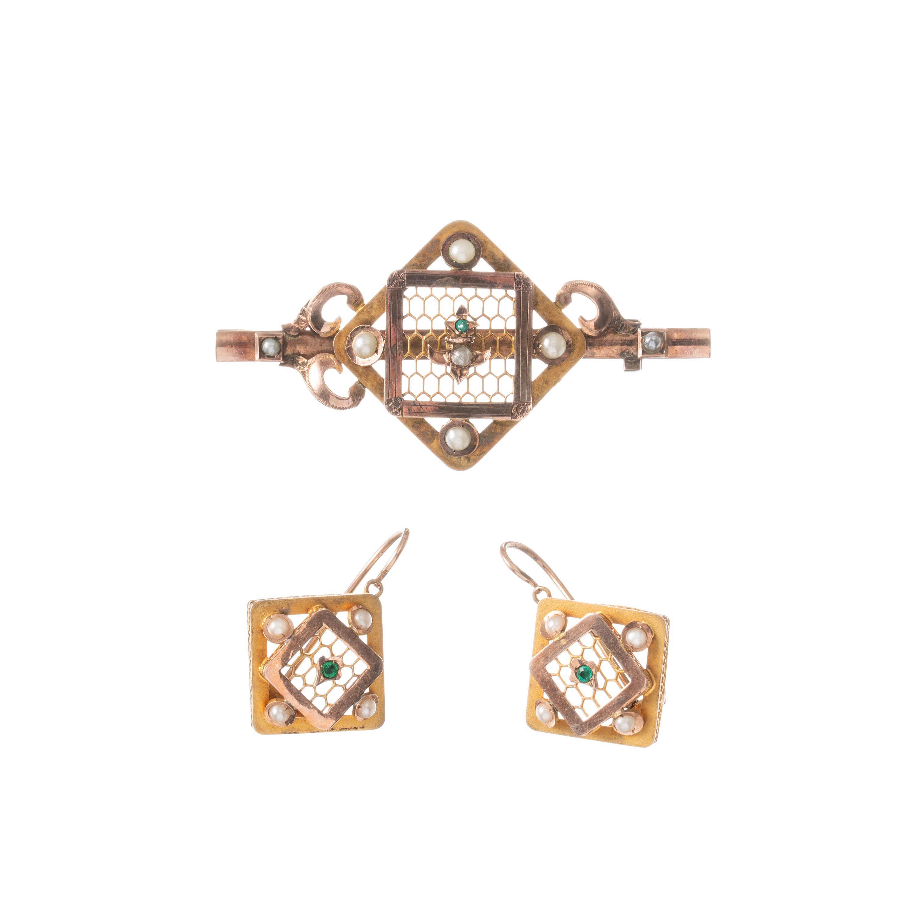 PAROURE, ORECCHINI E SPILLA IN ORO 9 KT CON PERLINE E SMERALDINI