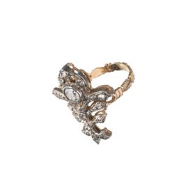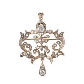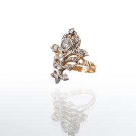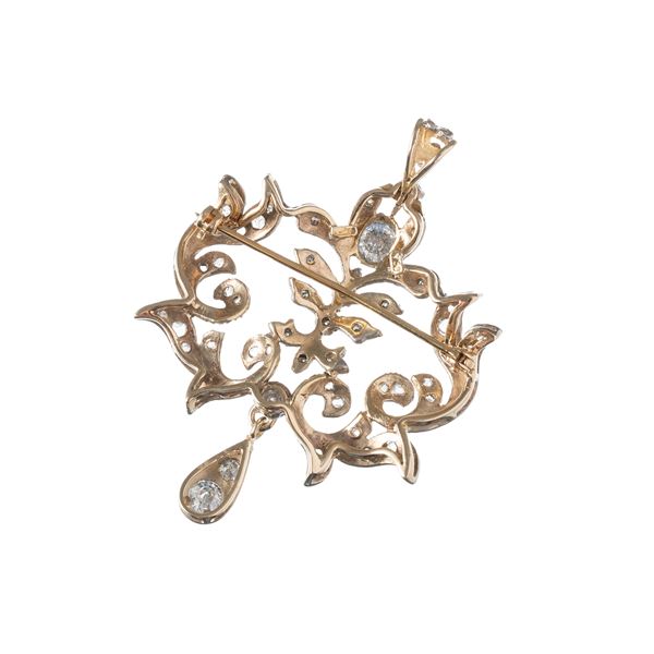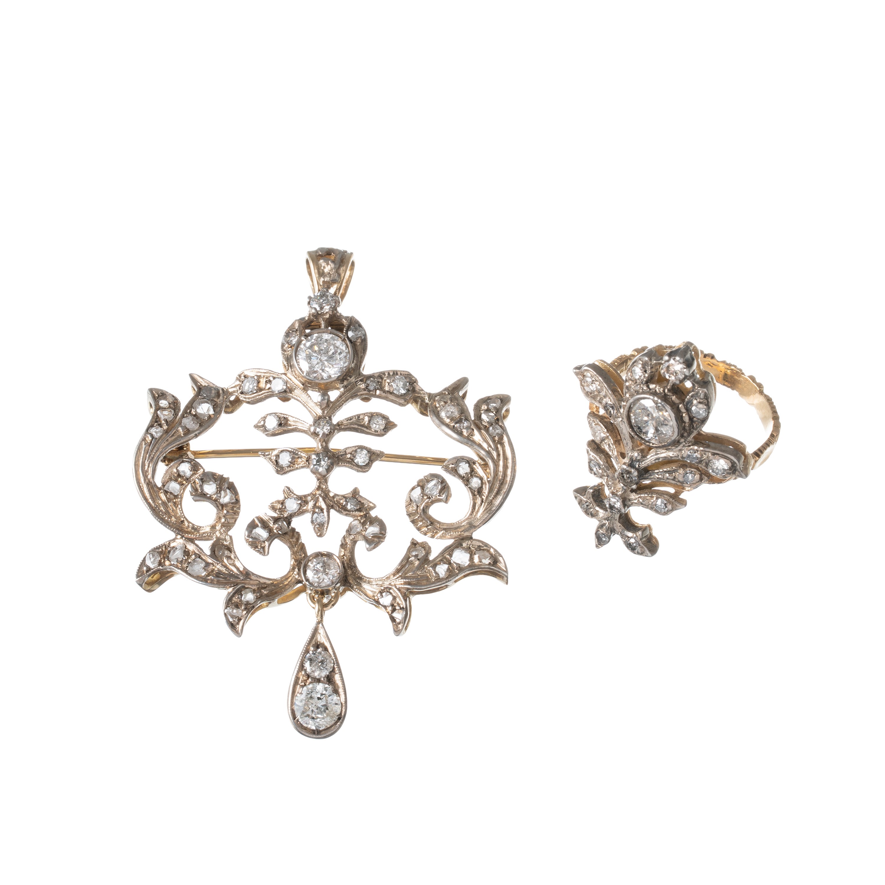 Anello in oro giallo 18 kt e argento, con pietra principale ct 0,60 ca, con contorno di diamanti, taglio huit-huit, e brillante per ct 0,20 ca. Spilla in oro giallo e argento.