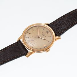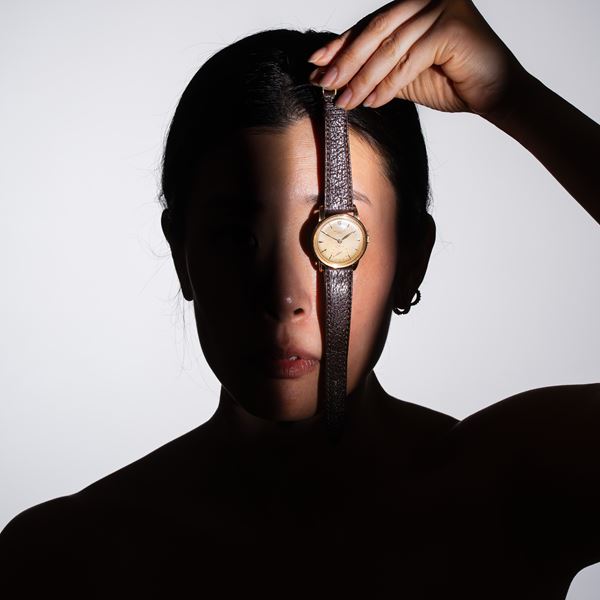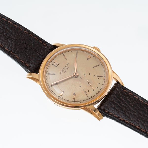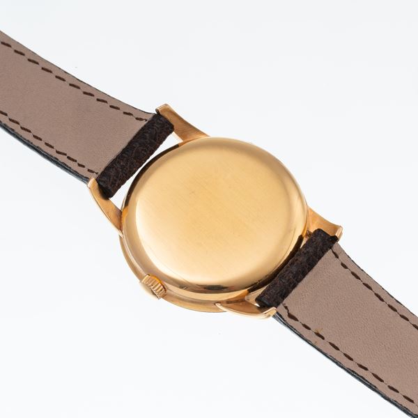 Note: Orologio solo tempo a carica manuale in oro rosa 18 kt. Sfere a foglia dorate, indici a bastone dorati e indice arabo ad ore dodici. Piccoli secondi ad ore sei. Cinturino in pelle. Anse e ghiera a scalino. Vetro plexiglas bombato. Fondello a pressione in oro rosa 18 kt. Peso testa orologio: 35 g. Peso totale: 42,1 g.