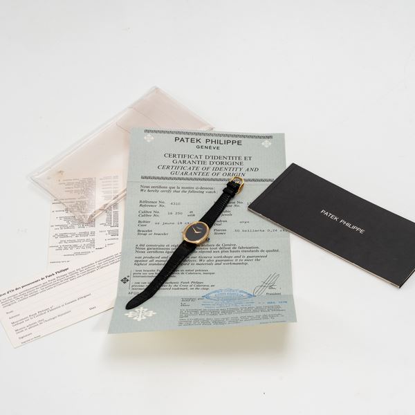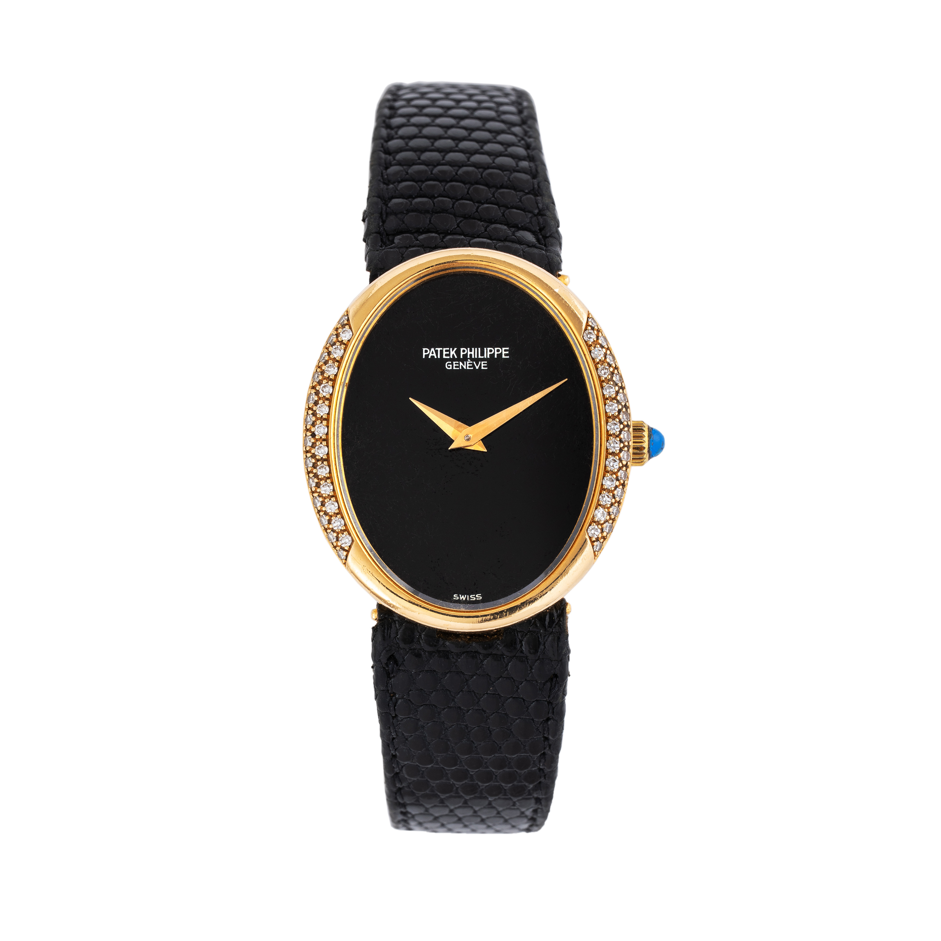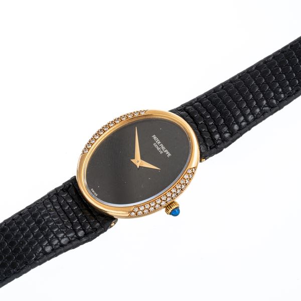 Note: Orologio solo tempo a carica manuale. Cassa in oro giallo 18 kt, quadrante onice, ghiera in diamanti taglio brillante. Sfere dauphine oro. Corona con cabochon blu. Cinturino in pelle. Fibbia in oro giallo 18 kt Patek Philippe. Vetro minerale piatto.