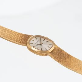 Note: Orologio a carica manuale in oro giallo 18 kt con bracciale integrato. Bracciale e cassa lavorati. Quadrante argenté. Indici e sfere a bastone. Bracciale integrato di lunghezza totale 17 cm. Vetro minerale piatto. Fondello a pressione. Peso totale: 55.3gr