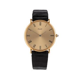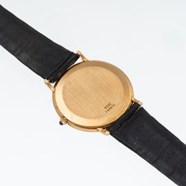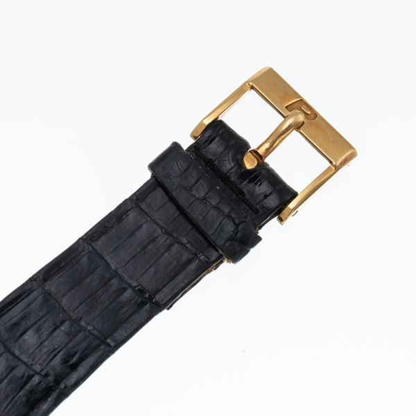 Note: Orologio solo tempo a carica manuale in oro giallo 18 kt. Quadrante champagne, indici arabi neri, sfere a bastone argentate. Corona con cabochon blu. Cinturino in pelle e fibbia in oro giallo 18 kt Piaget. Vetro minerale piatto. Fondello a pressione in oro giallo 18 kt. Peso totale: 29.4 g.