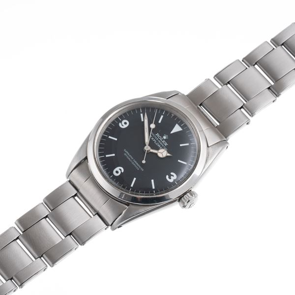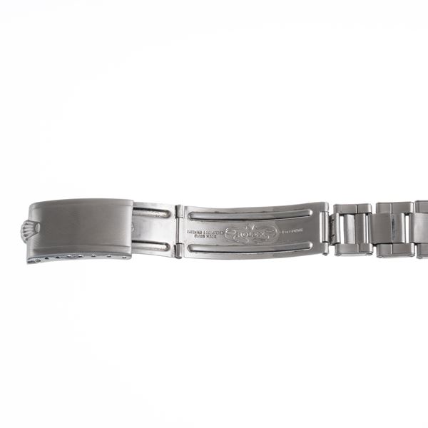 Note: Orologio solo tempo a carica automatica in acciaio. Quadrante nero, indici arabi ad ore tre, sei, nove e dodici con materiale luminescente. Sfere mercedes con materiale luminescente. Bracciale rivetti Rolex. Vetro plexiglass bombato. Fondello a vite in acciaio.