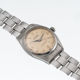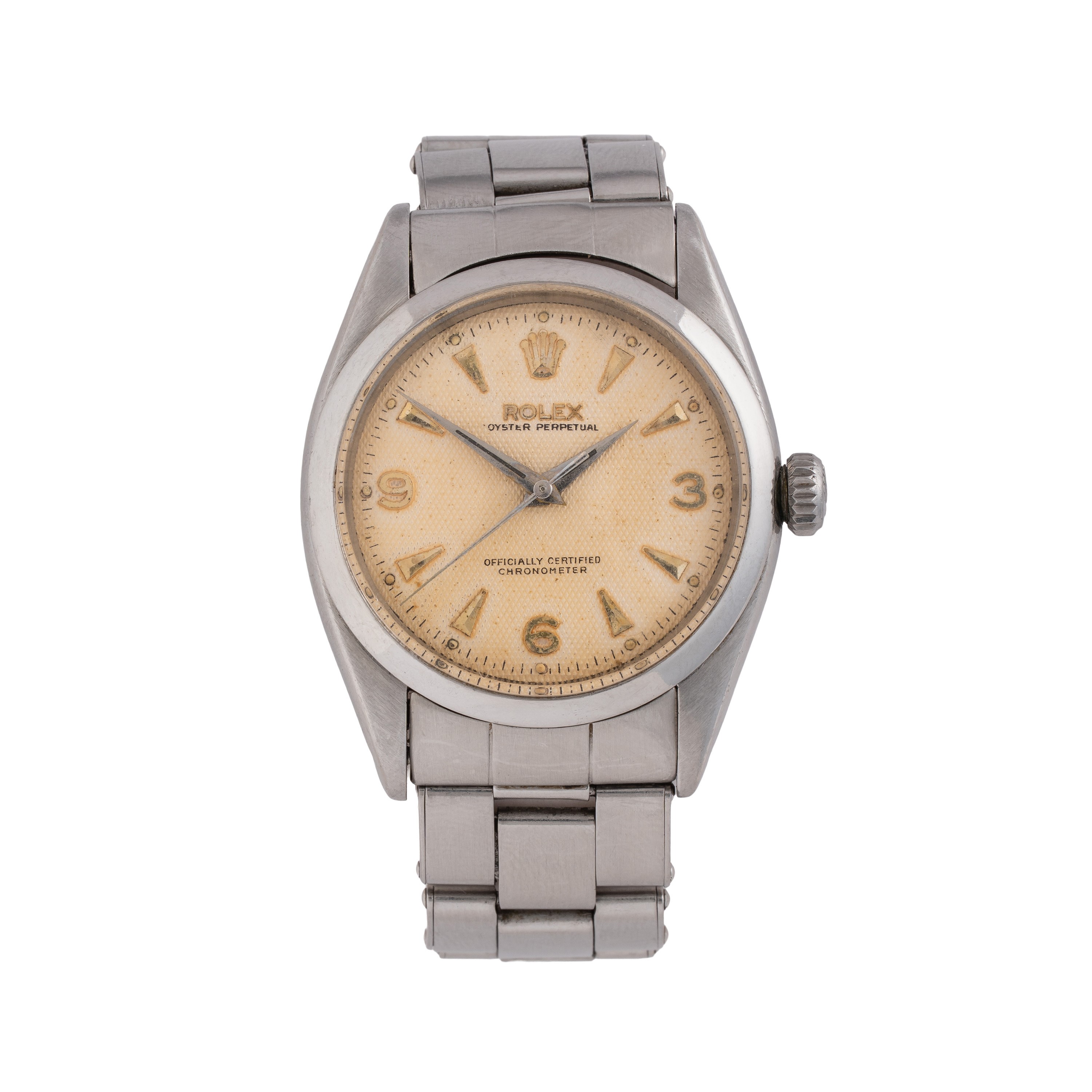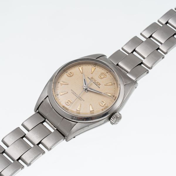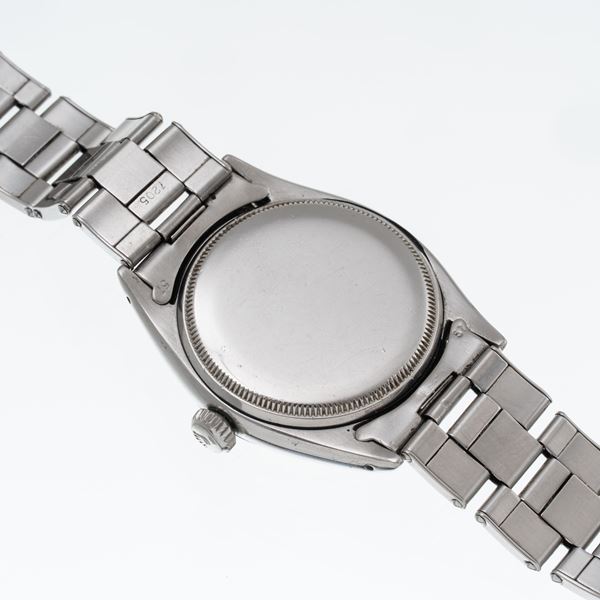 Note: Orologio solo tempo a carica automatica in acciaio. Quadrante a nido d'ape, indici arabi ad ore tre, sei, nove e dodici e a foglia con materiale luminescente. Sfere dauphine con materiale luminescente. Bracciale a rivetti Rolex. Vetro plexiglass bombato. Fondello a vite in acciaio.