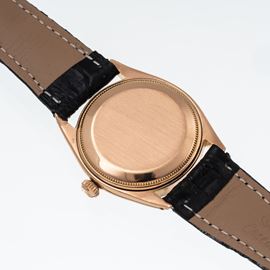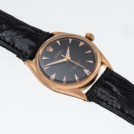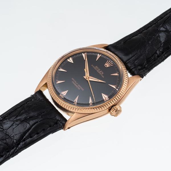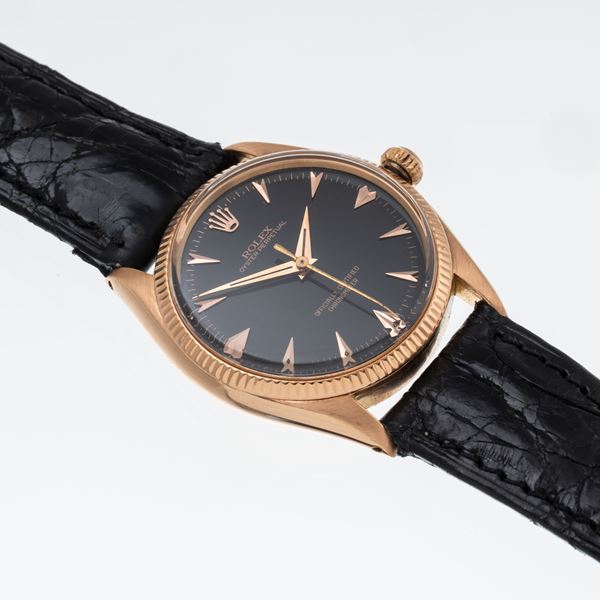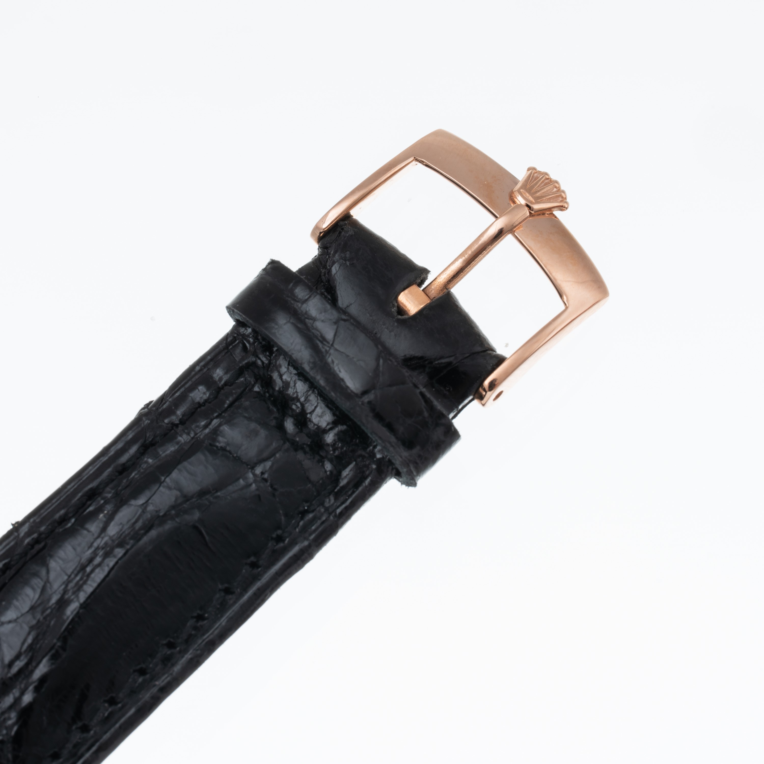 Note: Orologio solo tempo a carica automatica in oro rosa 18 kt. Quadrante nero, indici dorati, sfere dauphine dorate. Cinturino in pelle. Fibbia dorata Rolex. Vetro plexiglass bombato. Fondello a vite in oro rosa 18 kt. Peso testa orologio: 39 g. Peso totale: 47 g.