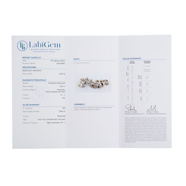 Spilla in platino con diamante principale da 1,50 ct, forma rotonda, colore K-L, taglio Vecchia Europa, purezza VS1 e sessanta diamanti di stimati 0,85 ct totali, incolori, forma rotonda, purezza VS-I, misure 50 X 20 mm, peso 8,52 gr
