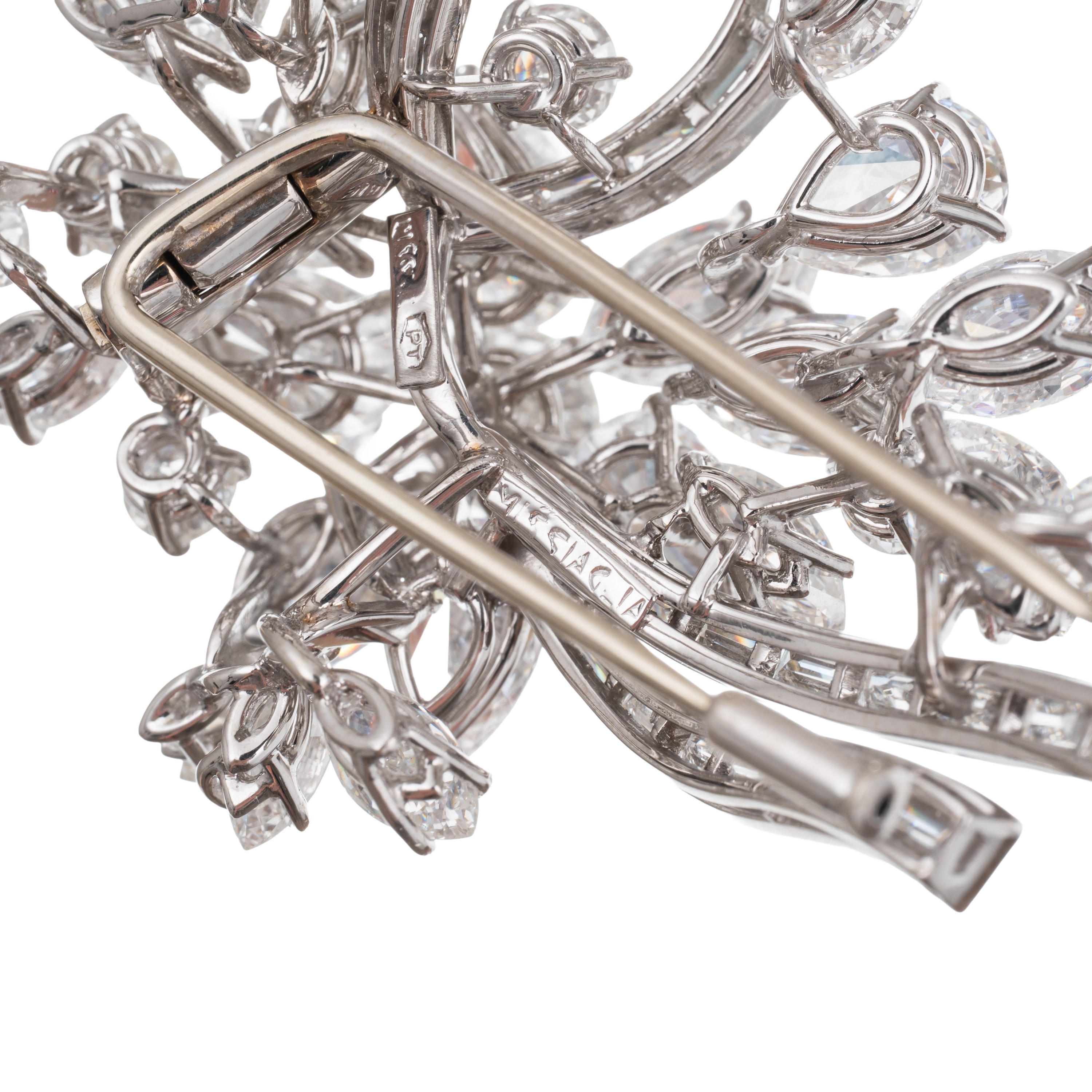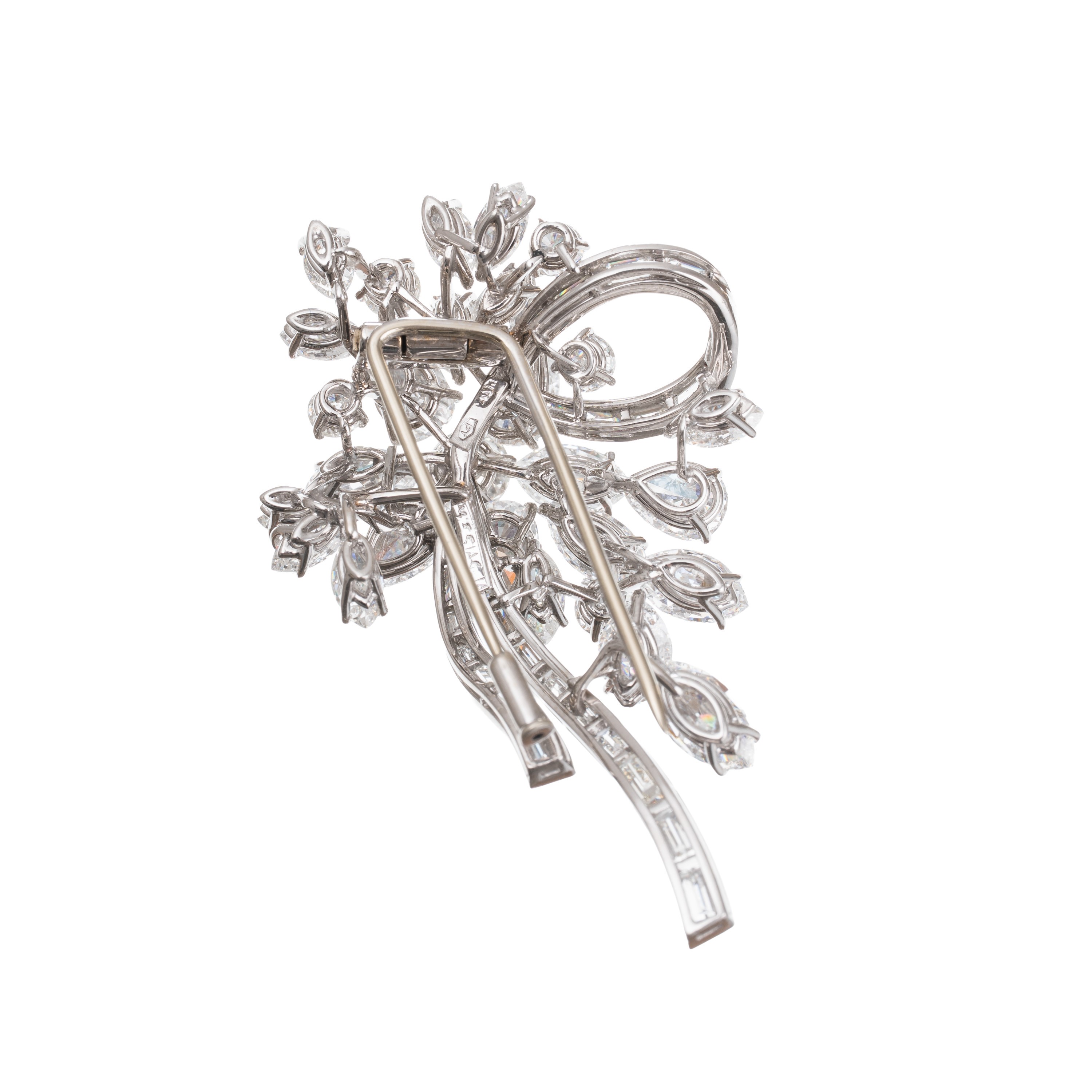 Spilla in platino con cinquantadue diamanti di 14,40 ct totali stimati, colore F-H, di varie forme, taglio brillante e taglio a gradini, purezza VVS-VS. Misure: 5,70X3,50 cm, peso: g 23,13.