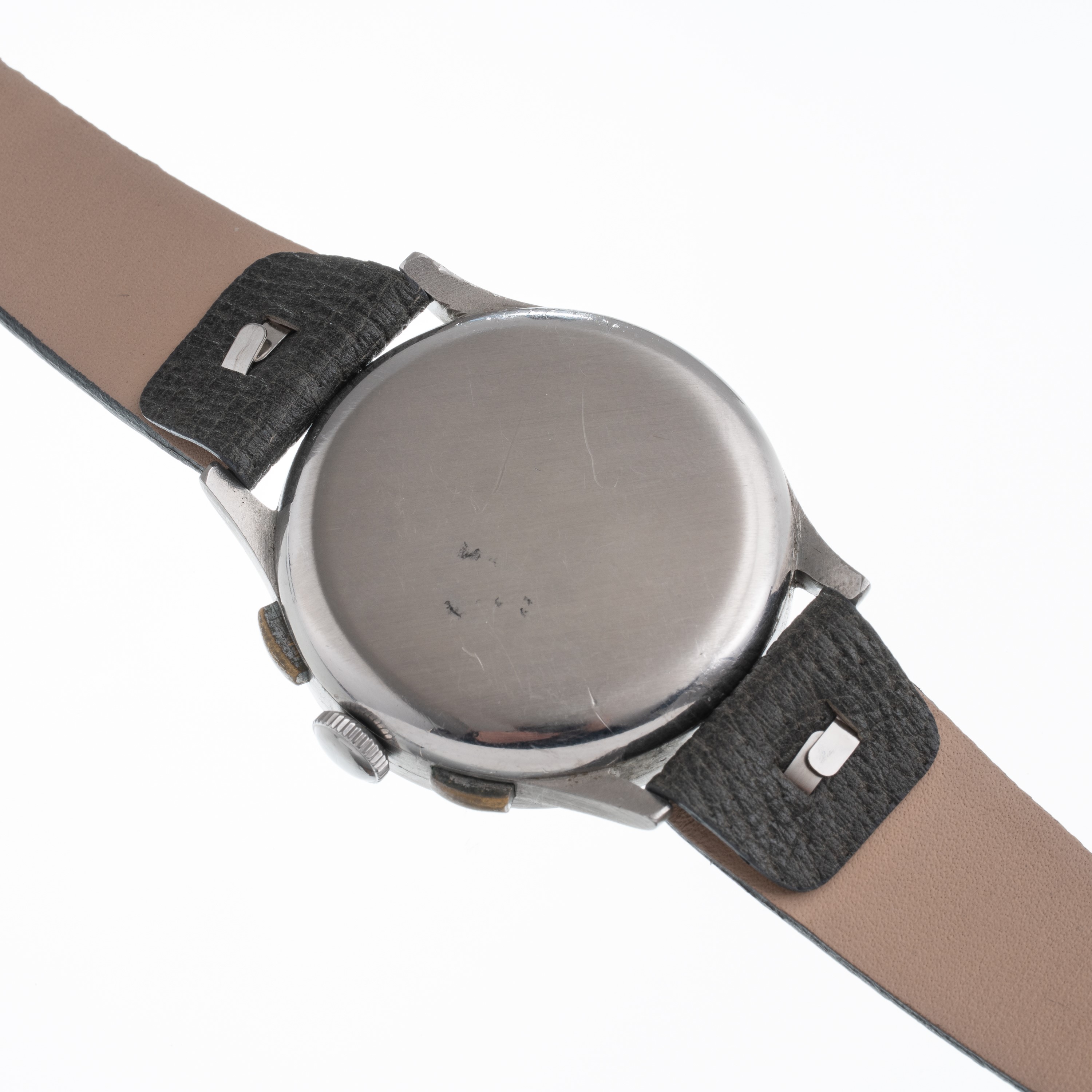 Note: Cronografo in acciaio a carica manuale. Quadrante argenté, scala telemetrica azzurra. Sfere a gladio bruite blu, sfera dei secondi a bastone brunita blu. Contatore dei secondi ad ore nove con sfera a bastone brunita blu, contatore dei minuti ad ore tre con sfera a freccia brunita blu. Vetro plexiglass bombato. Fondello in acciaio a pressione.
