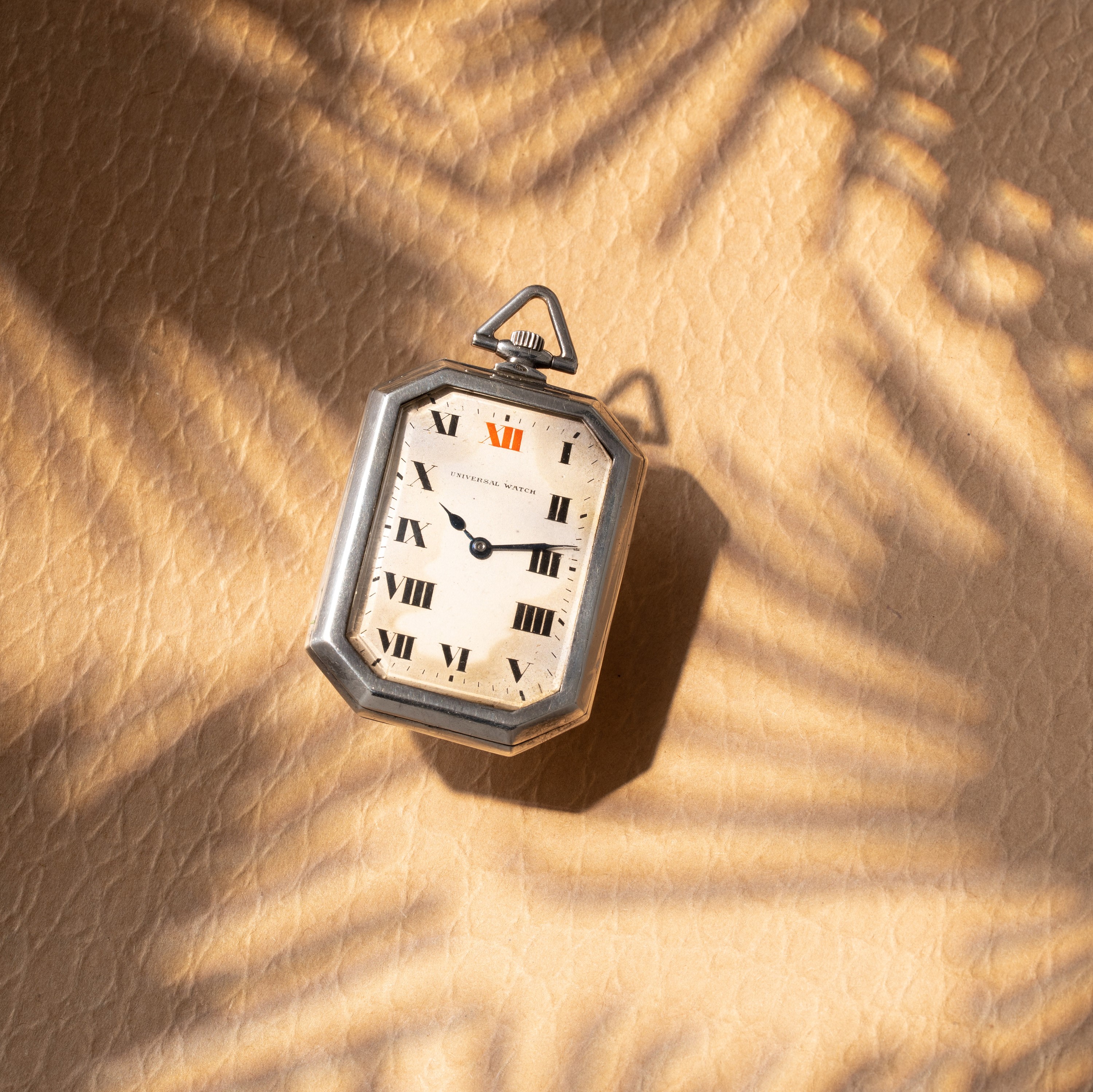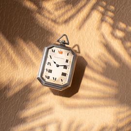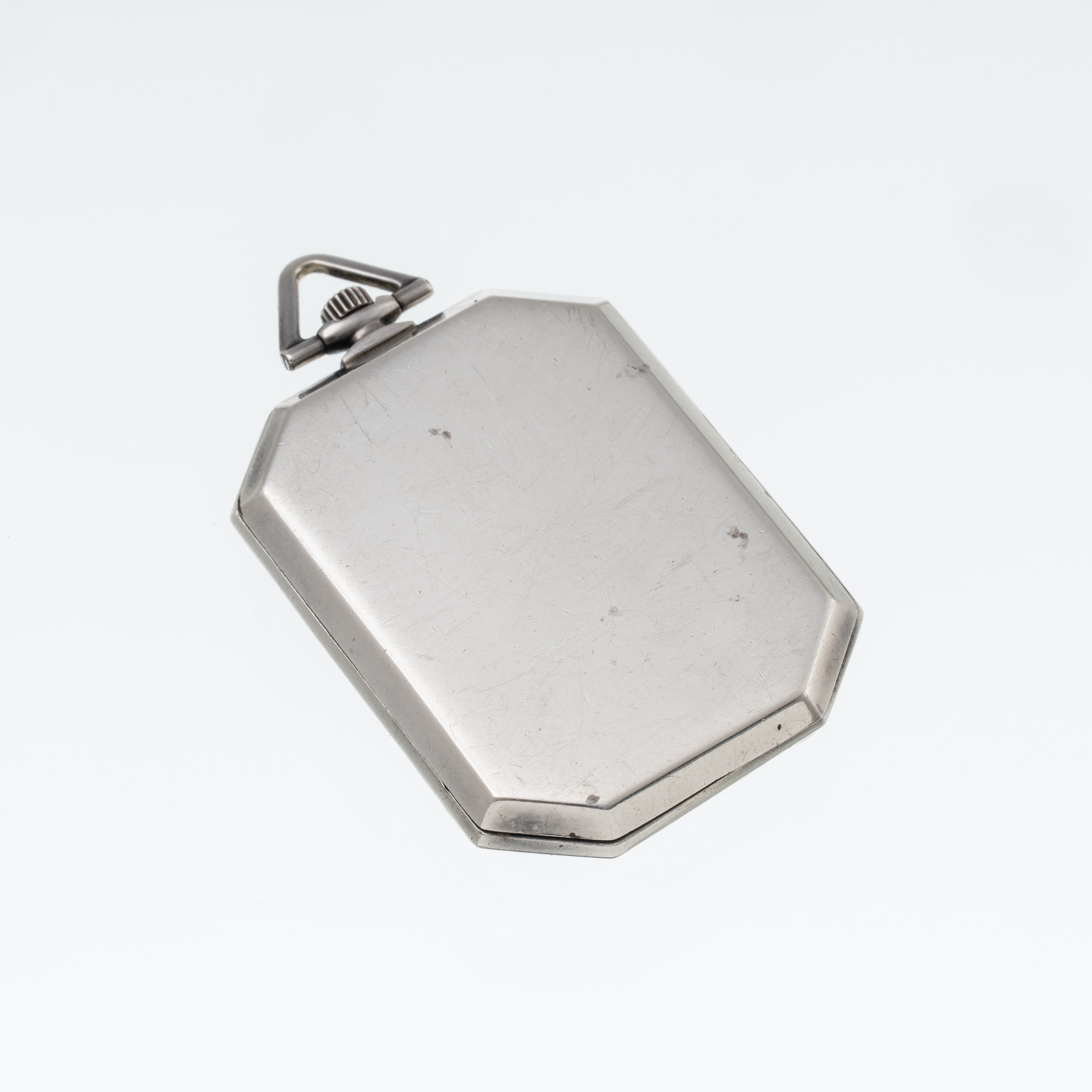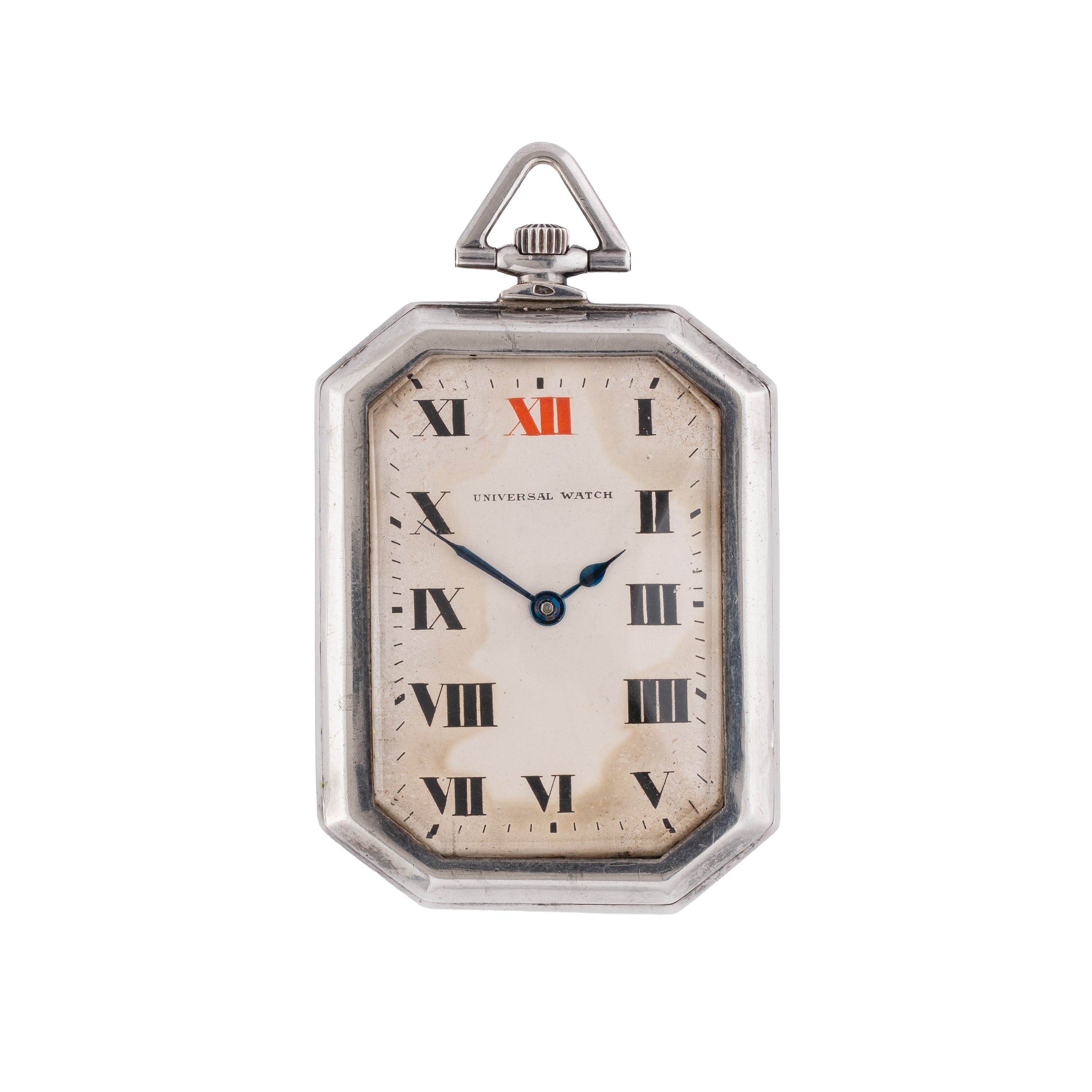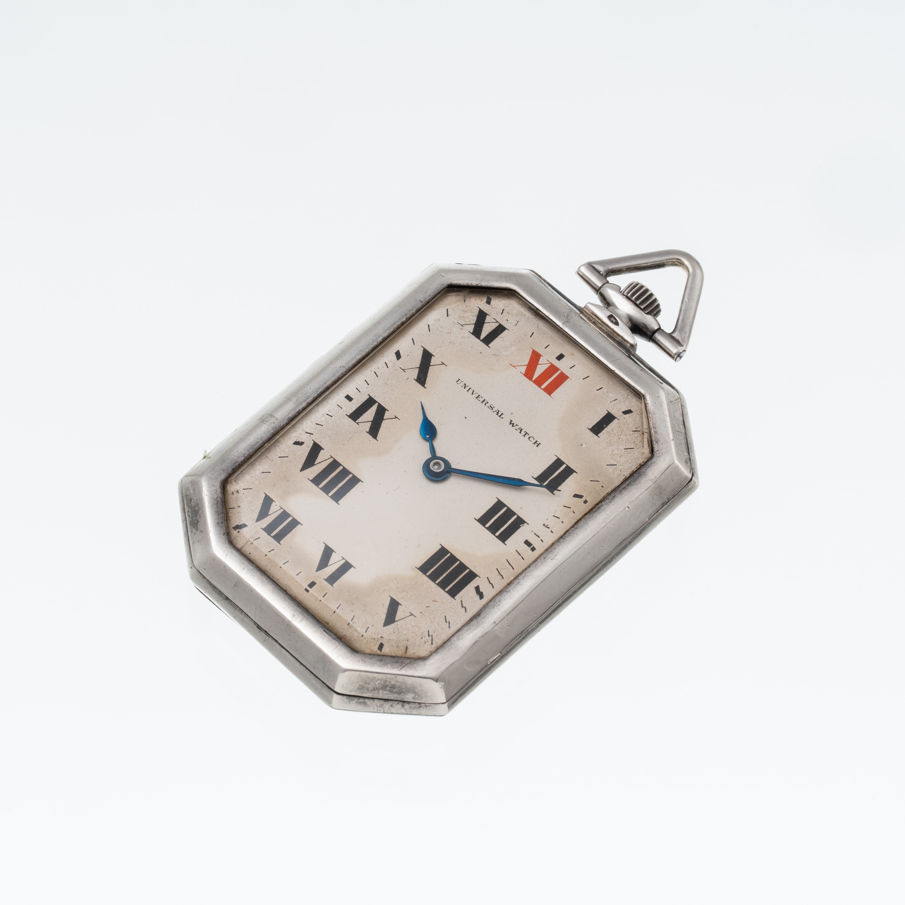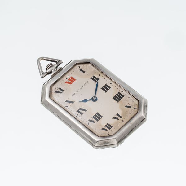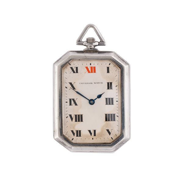 Note: Orologio da tasca ottagonale in argento a carica manuale. Quadrante bianco, indici romani neri e indice rosso a ore dodici. Sfere brunite blu. Fondello a pressione in argento. Vetro minerale bombato.