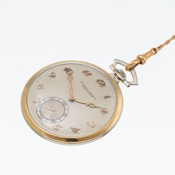 Note: Orologio da tasca in oro giallo e bianco 18 kt. Quadrante argenté, indici breguet e sfere dorate. Piccoli secondi ad ore sei. Catenella in oro giallo e bianco 18 kt. Vetro plexiglass bombato. Fondello in oro gaillo 18 kt a pressione.