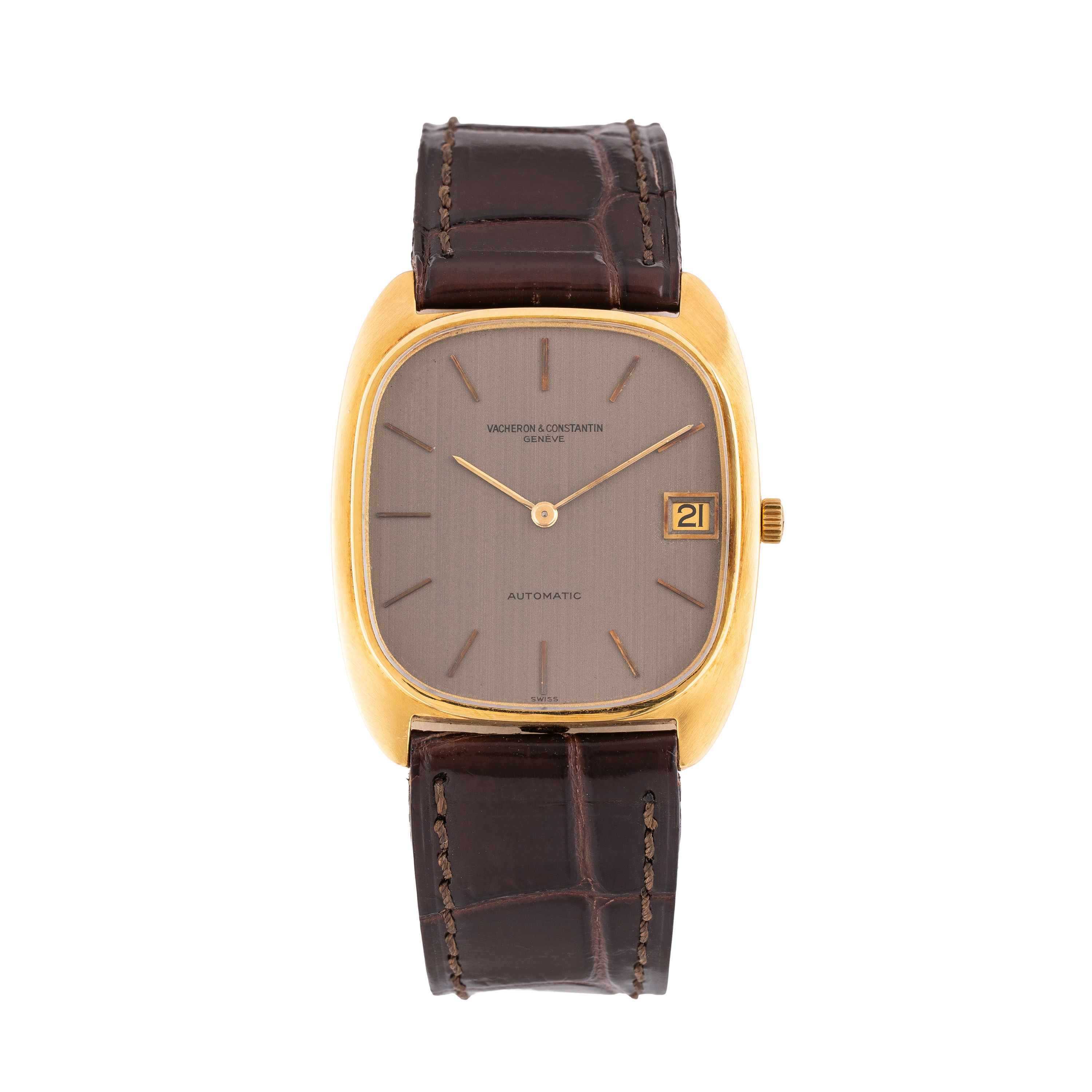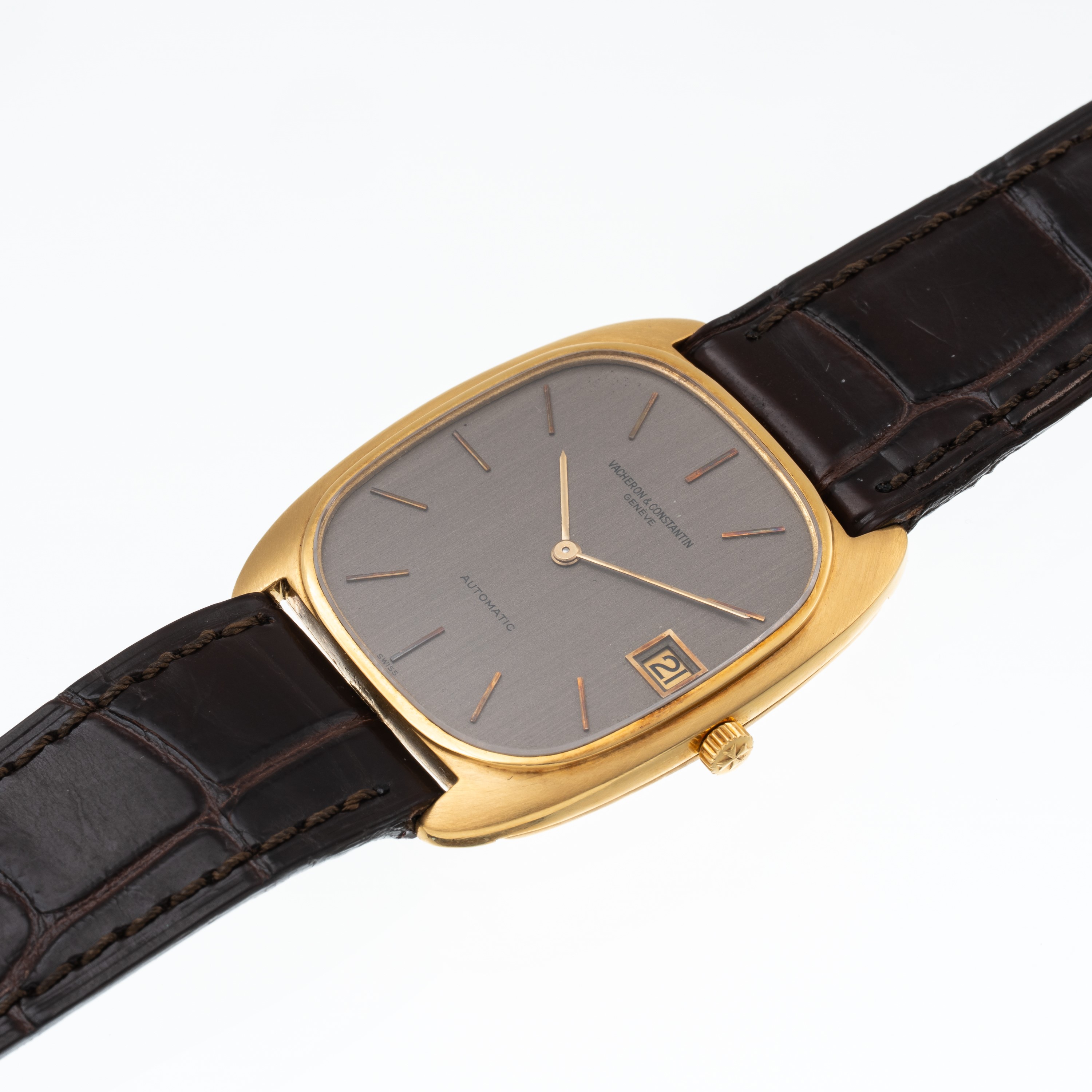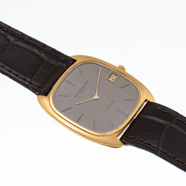 Note: Orologio solo tempo a carica automatica in oro giallo 18 kt. Quadrante grigio con datario ad ore tre, indici e sfere a bastone dorati. Cinturino in pelle. Fibbia in oro giallo 18kt Vacheron Constantin. Vetro minerale piatto. Fondello a pressione in oro giallo 18 kt. Peso testa orologio: 29,8 g. Peso totale: 38,3 g.