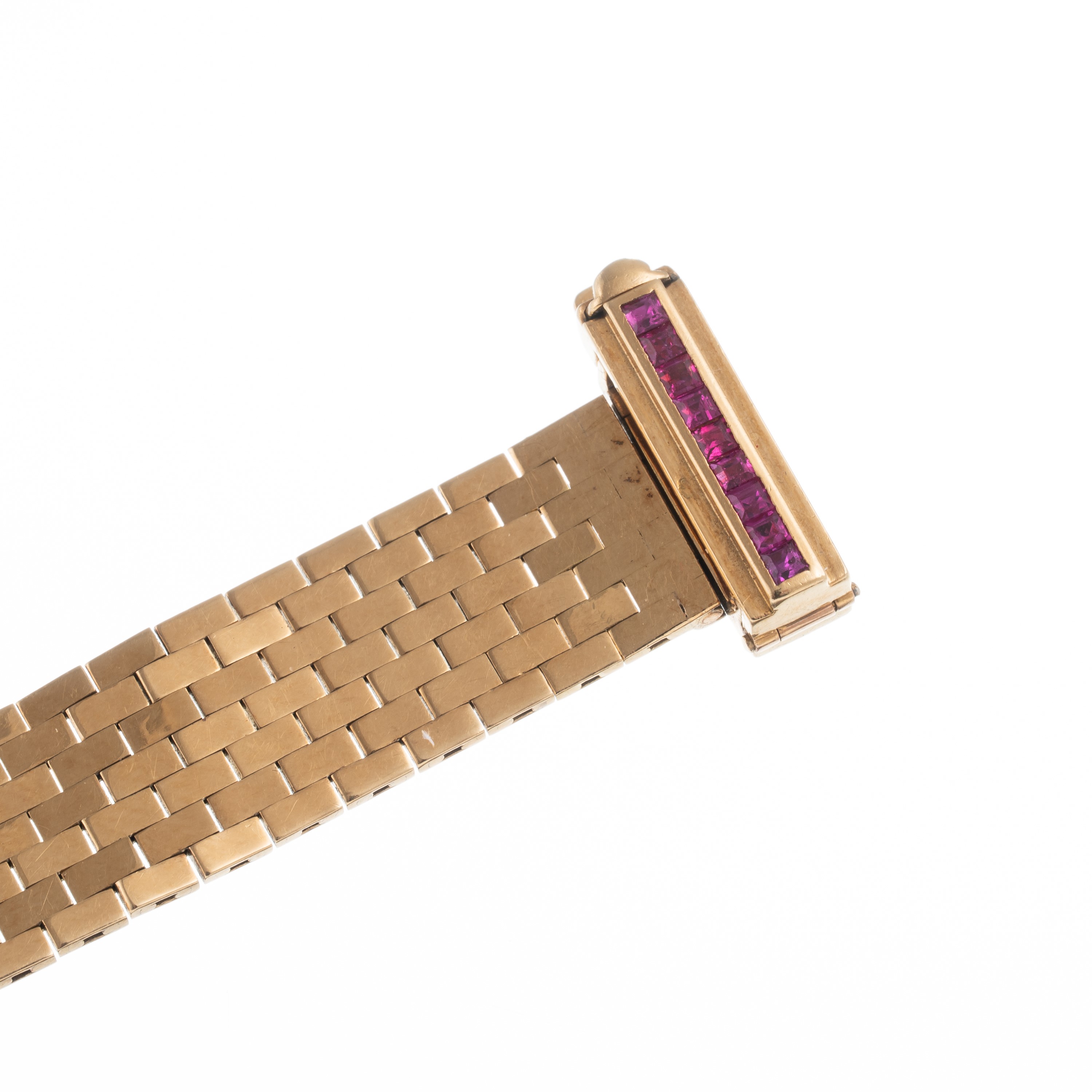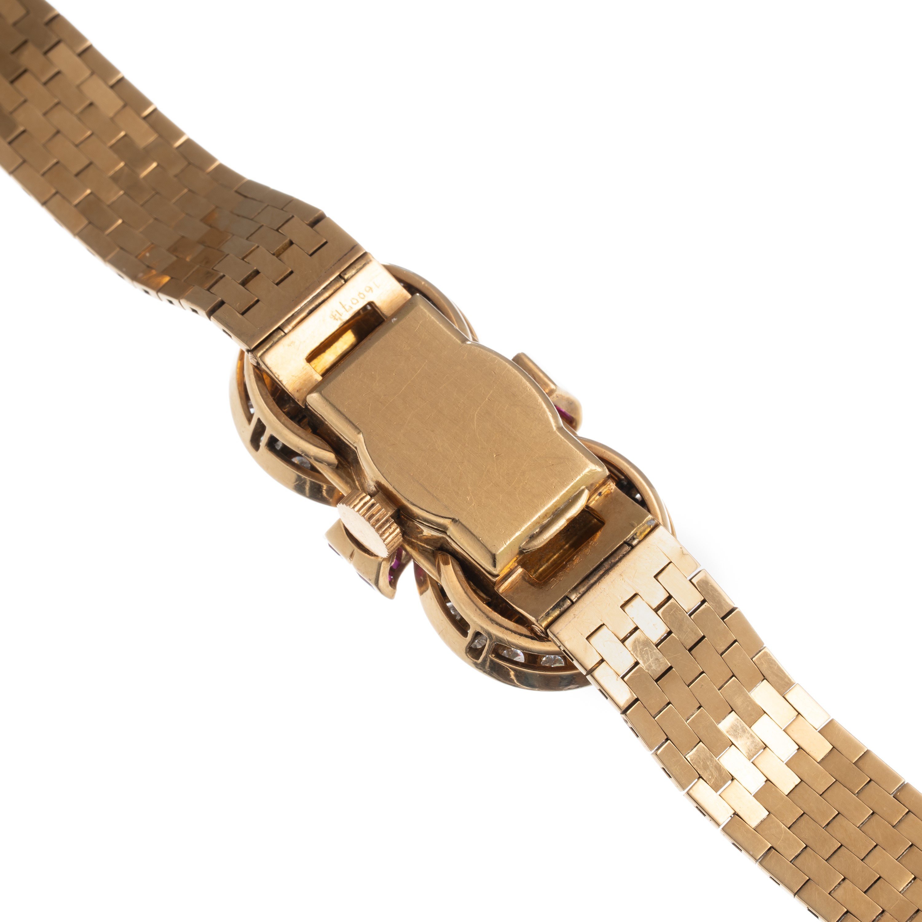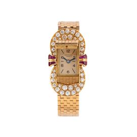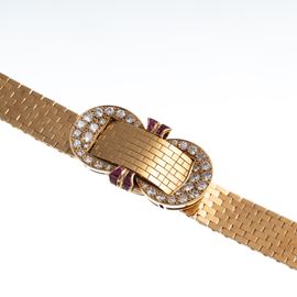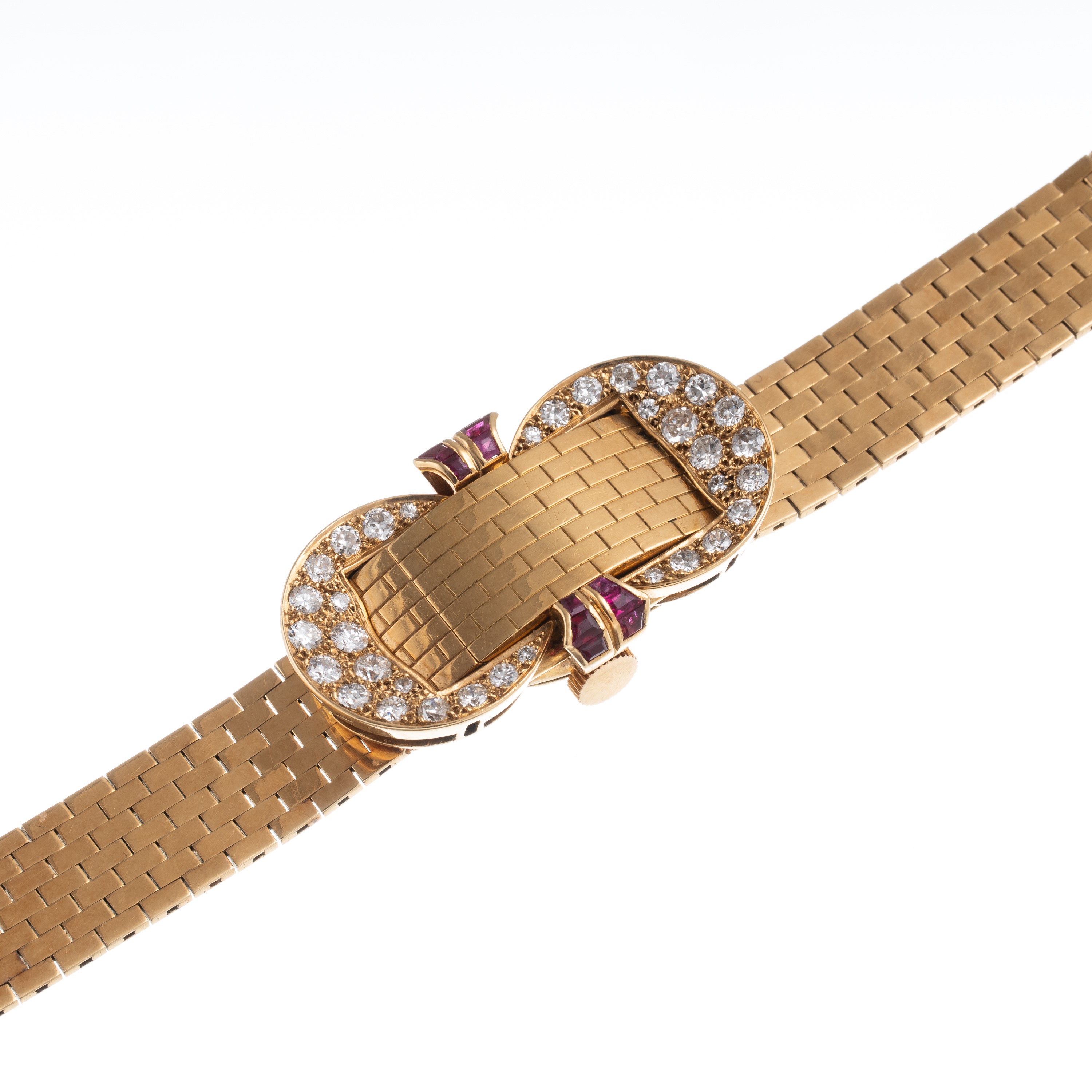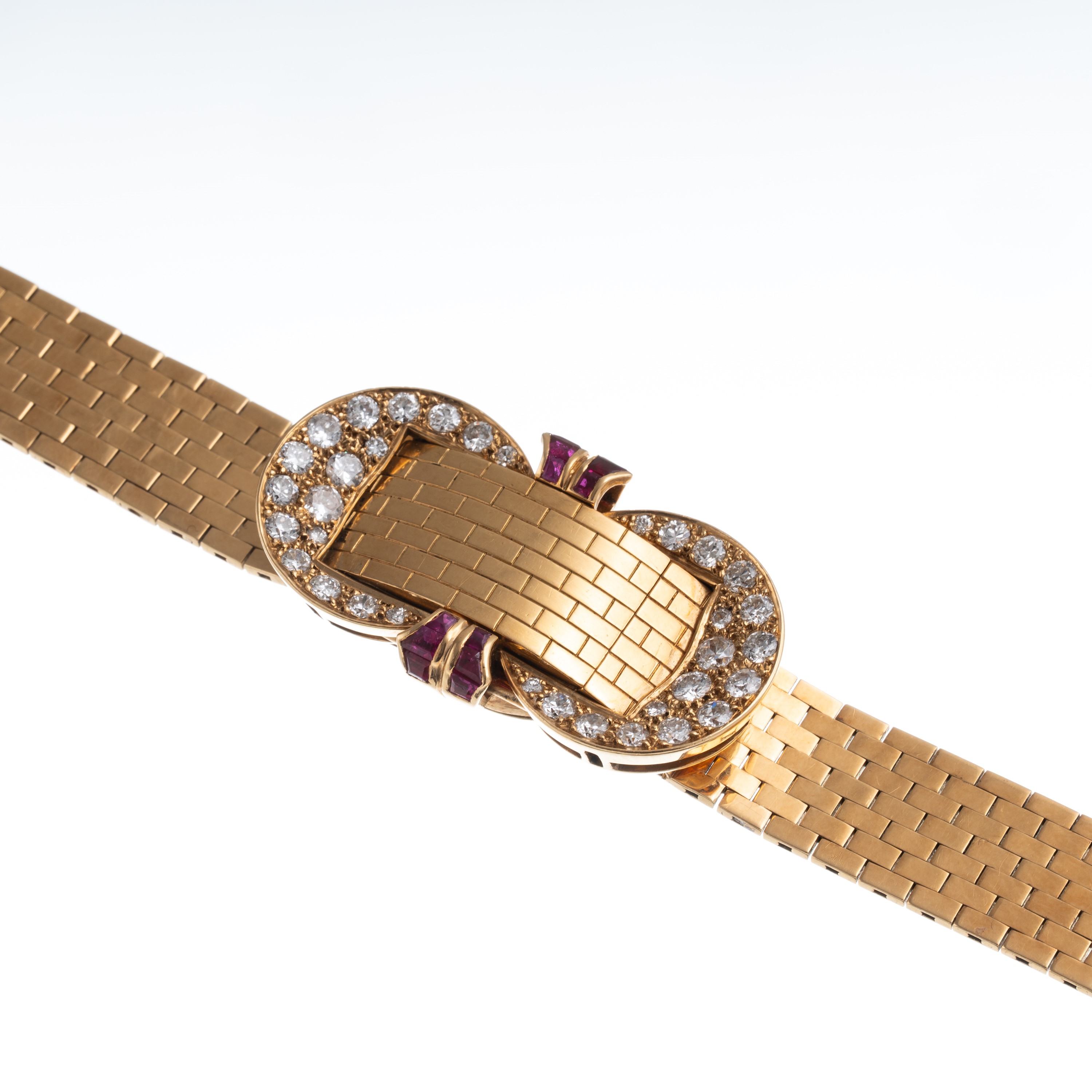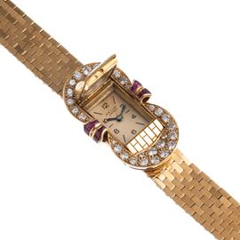 Note: Orologio solo tempo a carica manuale in oro giallo 18 kt, ghiera 'cabriolet' in oro giallo 18 kt, diamanti e rubini. Quadrante argenté, indici romani e a bastone neri, sfere a gladio brunite blu. Bracciale integrato in oro giallo 18kt di lunghezza 19 cm, clasp in oro giallo 18 kt con rubini. Vetro minerale piatto. Fondello in oro giallo 18 kt a pressione. Peso totale: 63.7 g.
