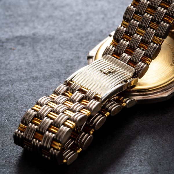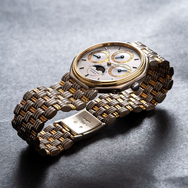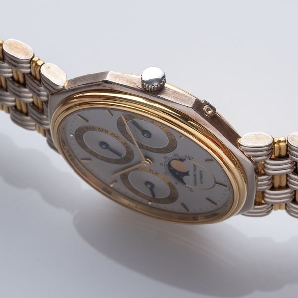 OROLOGIO A CARICA AUTOMATICA IN ORO GIALLO E BIANCO 18KT CON BRACCIALE INTEGRATO, CALENDARIO PERPETUO.