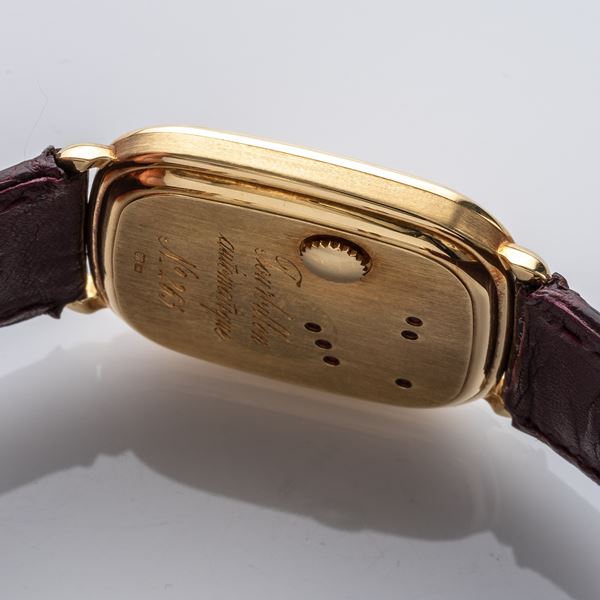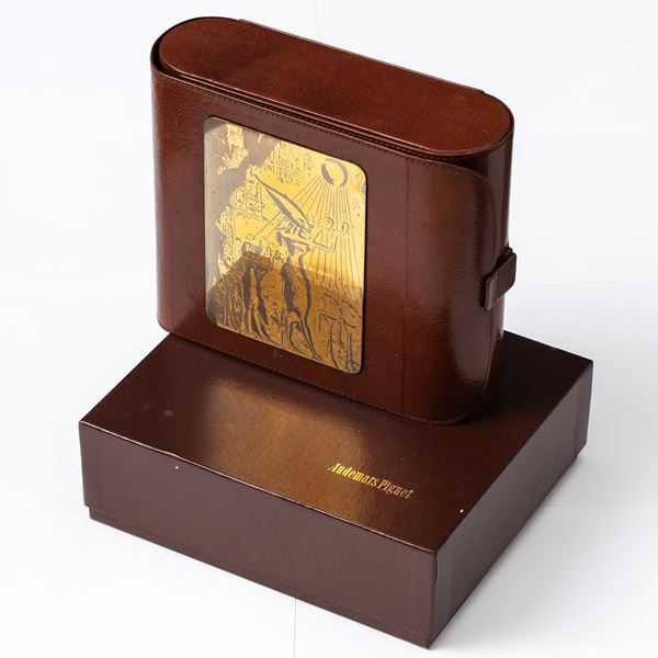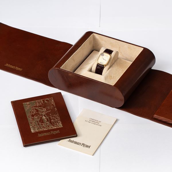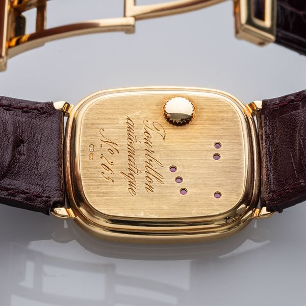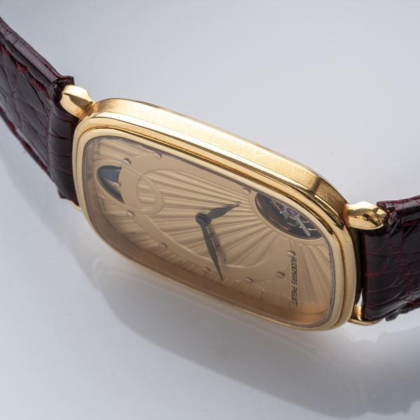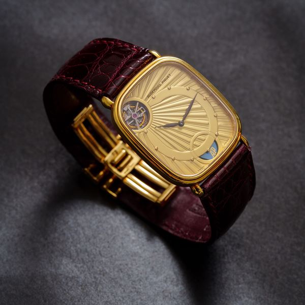 Note: Quadrante champagne lavorato, doppia finestra ad ore undici per tourbillion e ore sei per il martelletto di carica. Sfere a foglia brunite. Cinturino in pelle e deployante Audemars Piguet in oro giallo 18kt. Vetro minerale piatto.