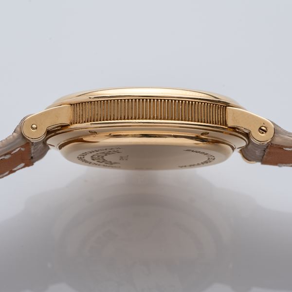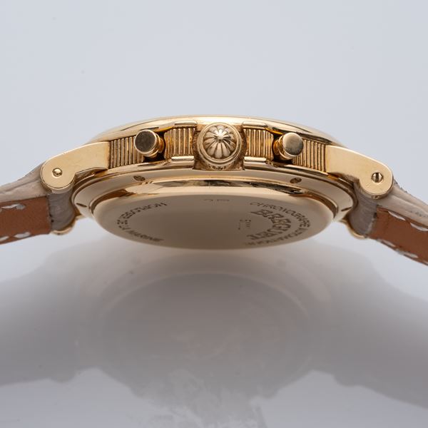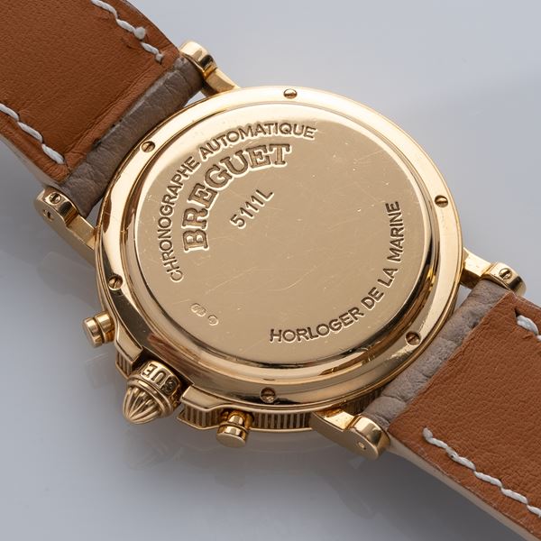 Note: Quadrante bitonale bianco con lavorazione guillochè. Indici romani, ghiera esterna con numeri arabi. Sfere breguet, tre contatori e datario ad ore sei. Vetro minerale piatto. Depolyant in oro giallo 18kt Breguet.