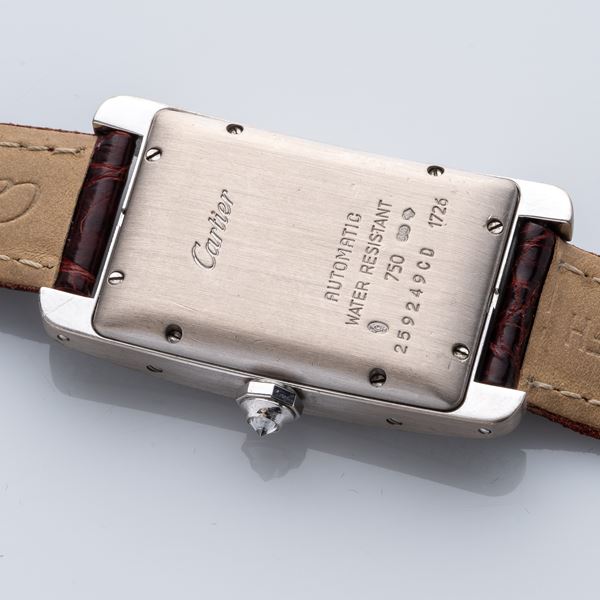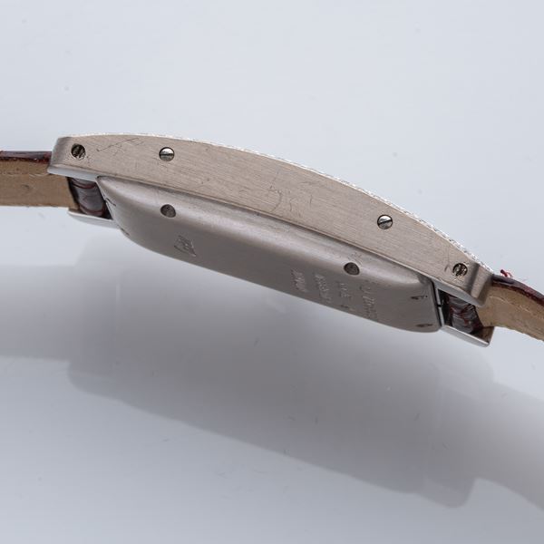 Note: Quadrante guillochè bianco con datario ad ore sei. Indici romani neri. Sfere a gladio blu. Ghiera in diamanti. Corona con zaffiro cabochon in diamante. Cinturino in pelle Cartier, fibbia in oro bianco 18kt Cartier. Vetro minerale curvo.