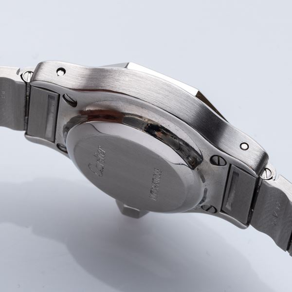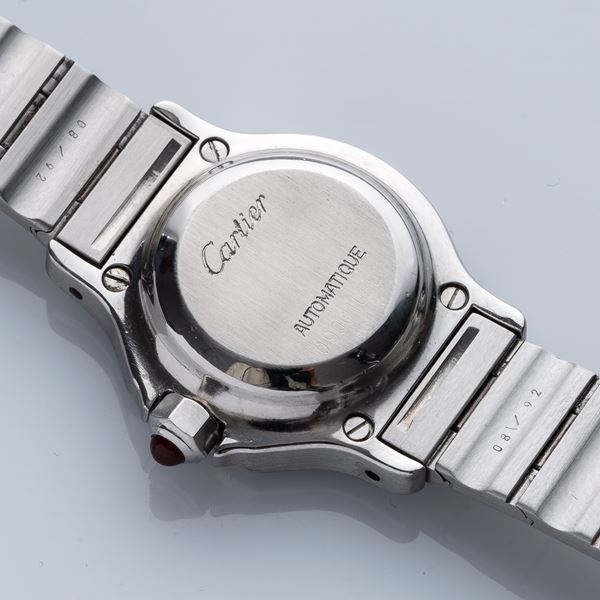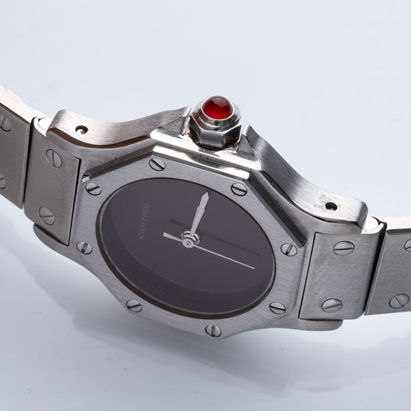 Note: Orologio in acciaio solo tempo con quadrante rosso, sfere a gladio in acciaio. Grafiche oro. Corona con rubino cabochon rosso. Carica automatica, cassa monoblocco. Vetro minerale piatto.