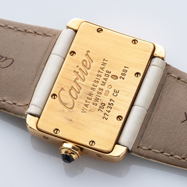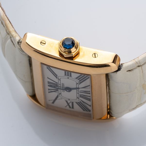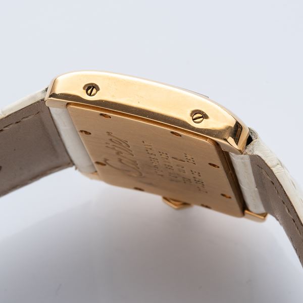 Note: Quadrante bianco con indici romani neri. Sfere a gladio blu. Fondello a vite, vetro minerale bombato. Cinturino in pelle e fibbia in oro giallo 18kt Cartier.