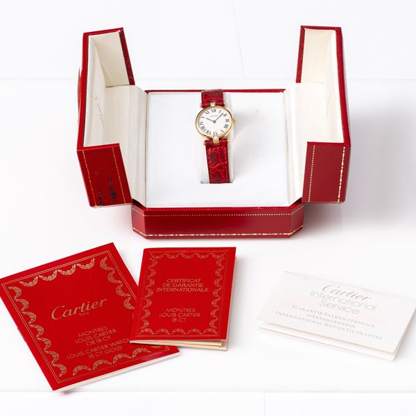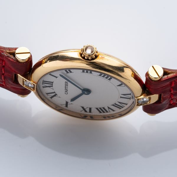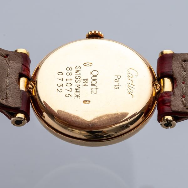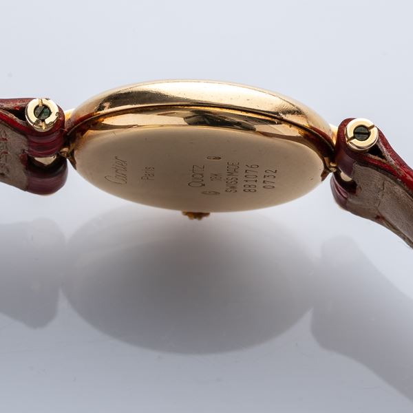 Note: Orologio in oro giallo 18kt, quadrante bianco con indici neri romani e sfere blu a bastone conico. Cinturino in pelle rosso, deployante in oro giallo 18kt Cartier. Scatola e garanzia.