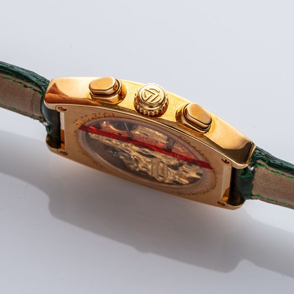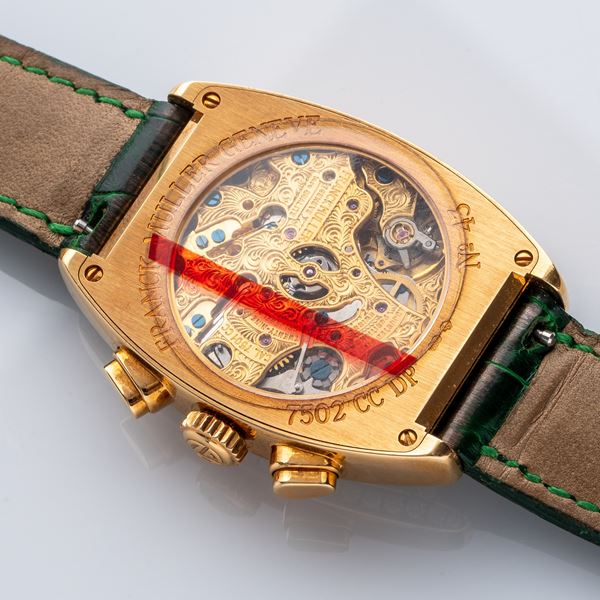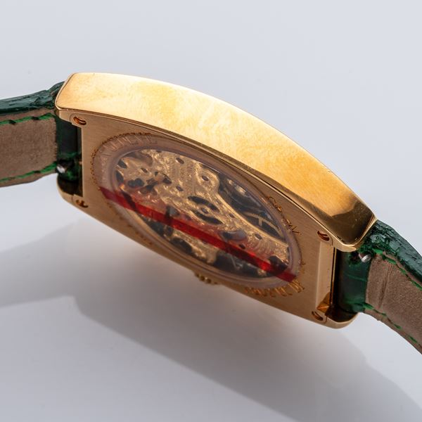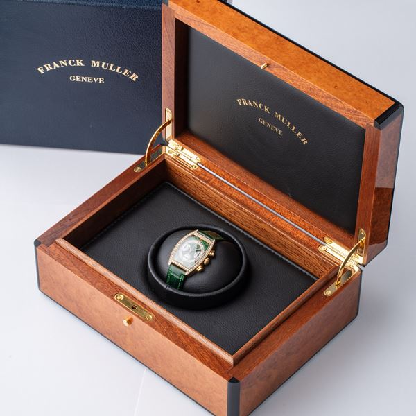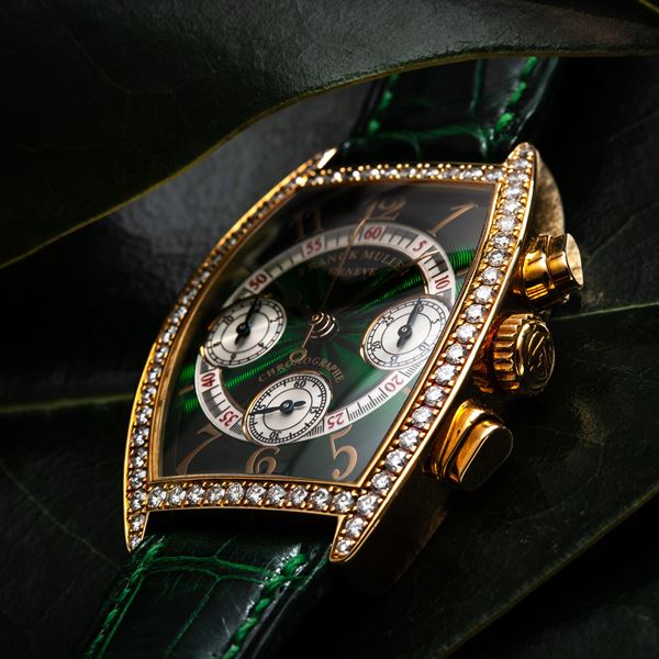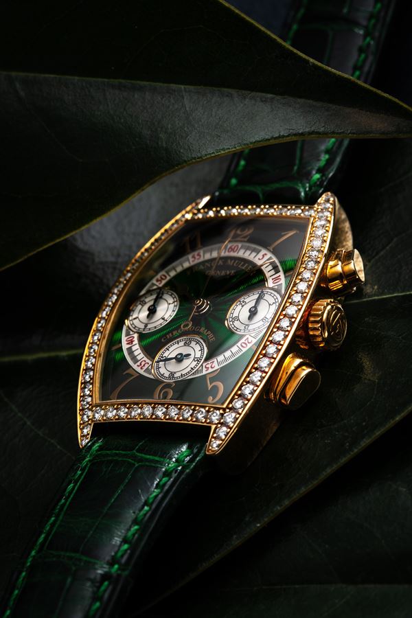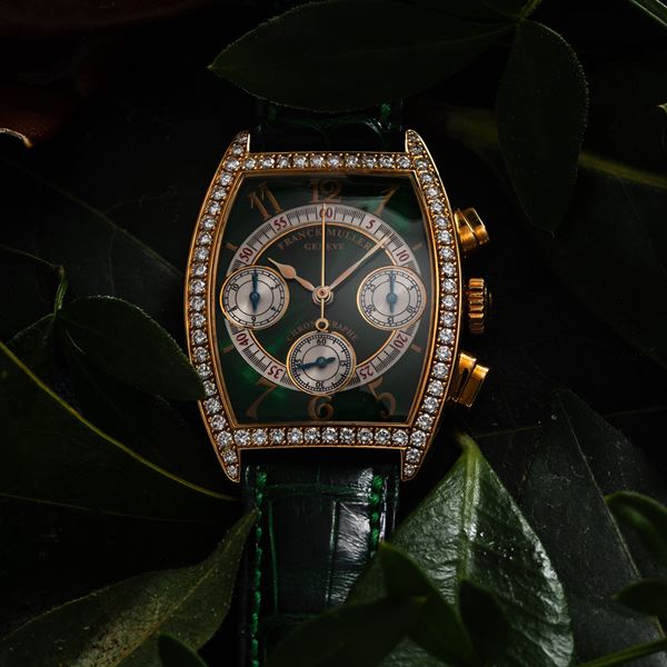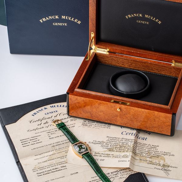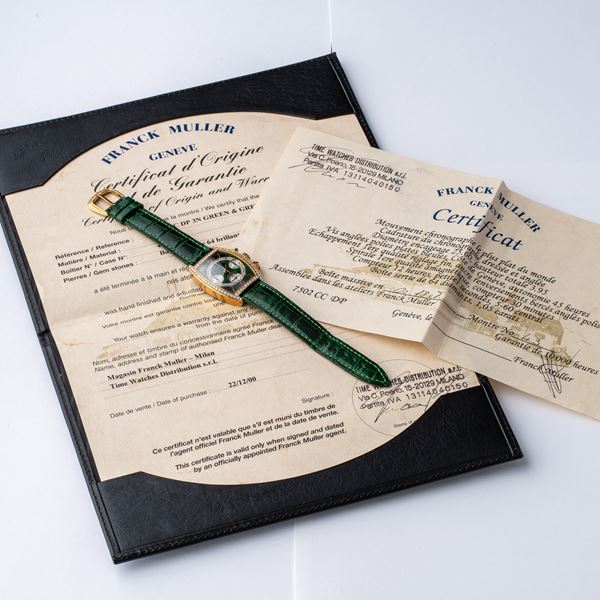 Note: Cassa in oro giallo 18kt, 64 brillanti da 1.05ct. Quadrante verde con lavorazione guillochè. Indici delle ore arabi di colore oro, indici dei minuti romani di colore rosso. Sfere cattedrali in oro giallo. Fondello a vista. Cinturino in pelle verde Frank Muller, fibbia in oro giallo 18kt e diamanti Frank Muller. Orologio in edizione limitata. Scatola e garanzia.