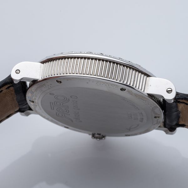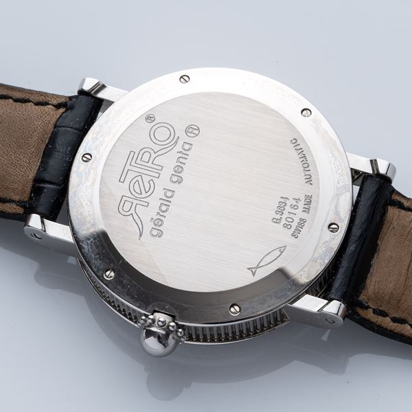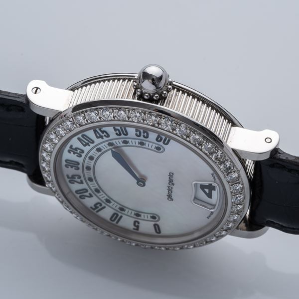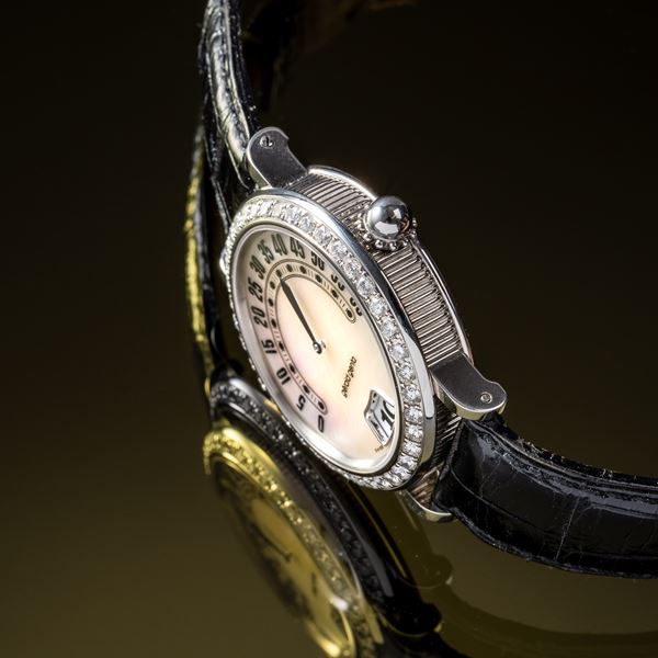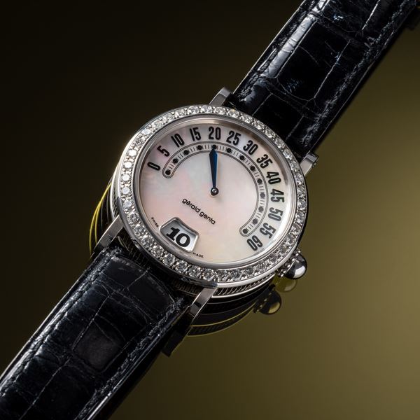 Note: Orologio con quadrante in madreperla con funzione retrograda. Sfera delle ore ad ore sei, sfera dei minuti a gladio blu. Vetro minerale piatto. Cassa in acciaio con ghiera in diamanti. Cinturino Gerald Genta, fibbia in acciaio Gerald Genta.
