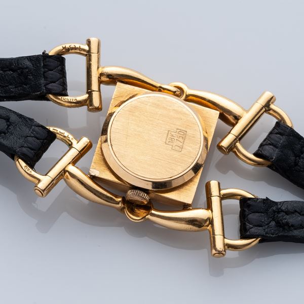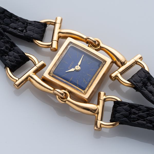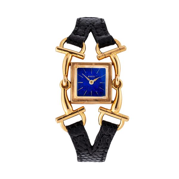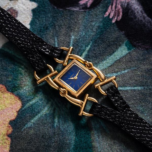 sacche, stivali e foderi, facendone invece un punto peculiare all’interno della propria produzione. L’utilizzo del legno, elemento che fu ripreso più volte, il ferro di cavallo, la doppia G che richiama le iniziali del fondatore del brand e il morsetto hanno delineato uno stile e varcato varie epoche storiche contraddistinguendosi e creando un' immagine unica. Proprio il morsetto venne introdotto nel 1952 inizialmente sui mocassini da uomo per poi divenire uno dei dettagli caratteristici Gucci, trovando spazio sulla maggior parte degli articoli di produzione, tra cui per l’appunto l’orologio. Questo magnifico esemplare unisce l’eleganza e lo stile tipico degli anni ’50 e ’60. Il colore dell’oro giallo sposa i toni del blu naturale in pietra di lapislazzuli del suo quadrante; il cinturino in pelle si suddivide nelle due estremità delle staffe congiungendosi in maniera elegante ed armoniosa lasciando leggerezza alla carrure.