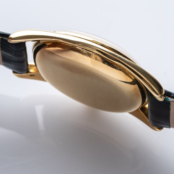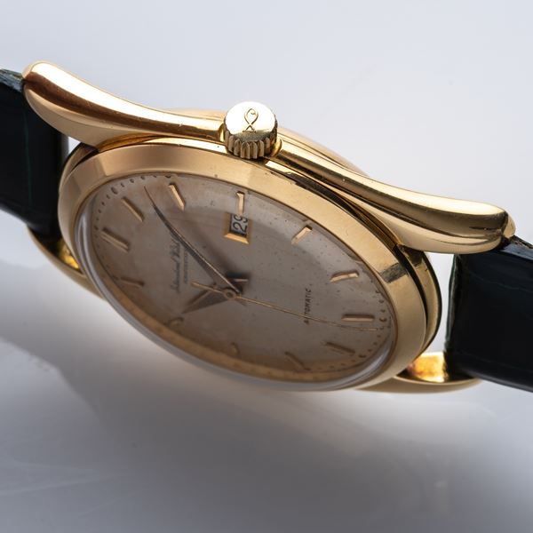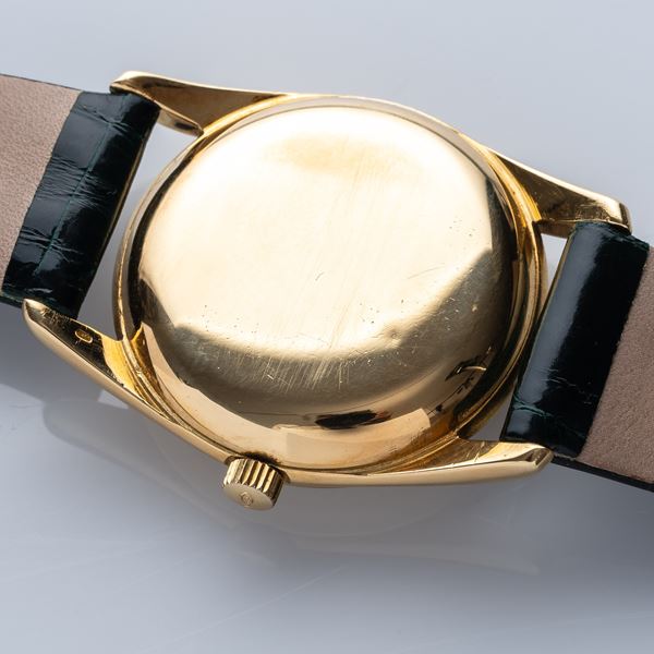 Note: Quadrante argentè con indici a bastone in oro. Sfere dauphine in oro giallo. Datario ad ore tre. Corona logata. Cassa in oro giallo 18 kt a pressione. Vetro plexi bombato.