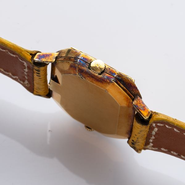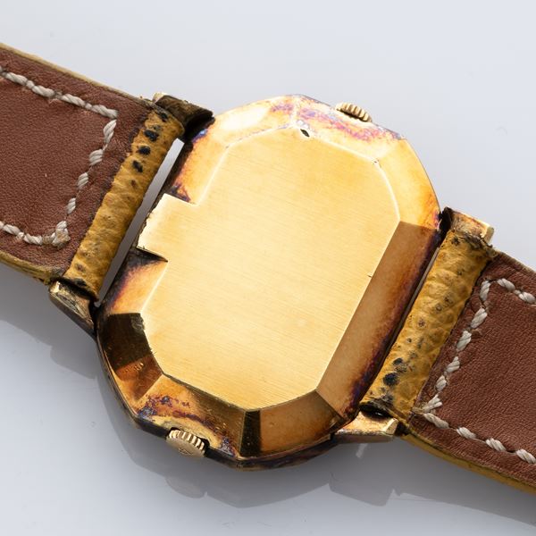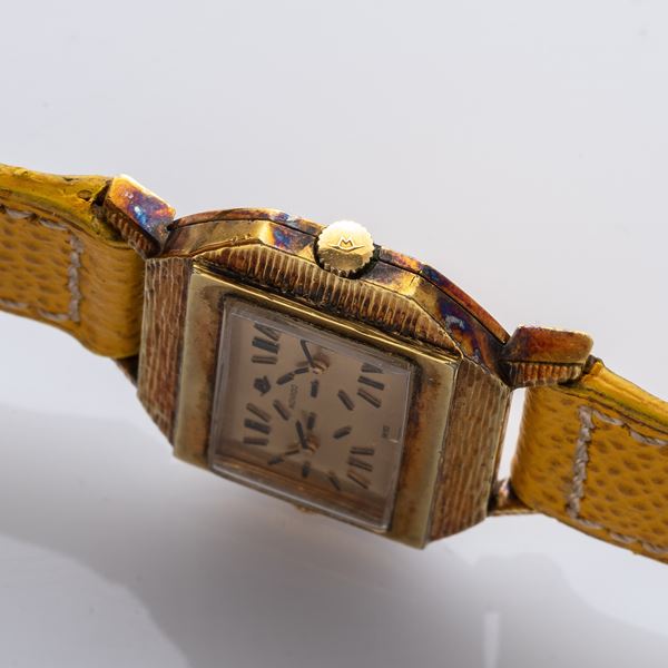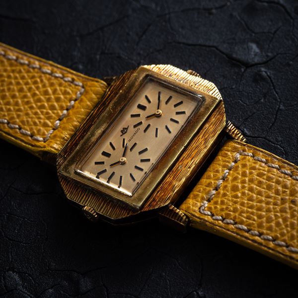 Note: Cassa placcata oro con lavorazione "corteccia". Quadrante champagne, sfere a bastone. L’orologio è animato da due movimenti a carica manuale Movado cal 58. Vetro plexi.