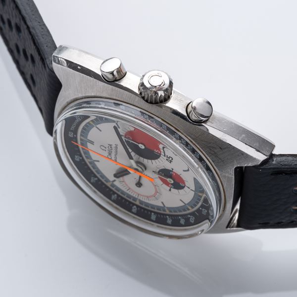 Note: Quadrante bianco, ghiera tachimetrica esterna nera, numeri bianchi. Sfere nere con materiale luminescente. Contatori delle ore e dei minuti bicolore: nero e rosso. Vetro plexi logato Omega.
