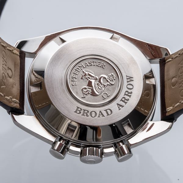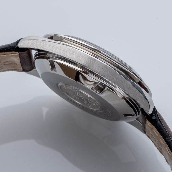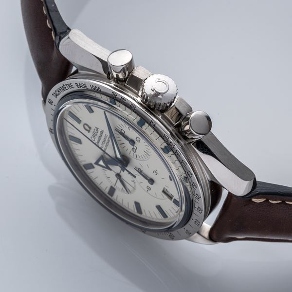 Note: Quadrante bianco con tre contatori, indici applicati neri e sfere broad arrow con materiale luminescente. Datario ad ore sei. Cinturino in pelle e deployante in acciaio Omega. Fondello a pressione, vetro plexi piatto.