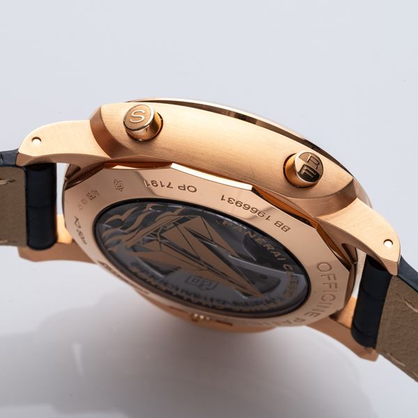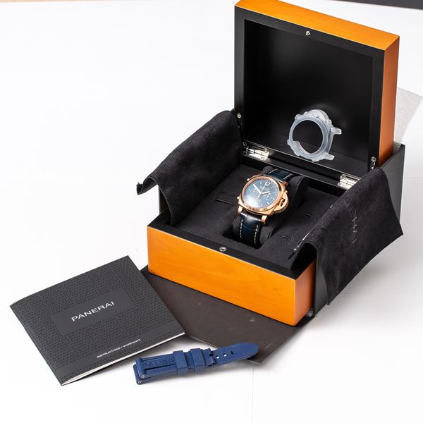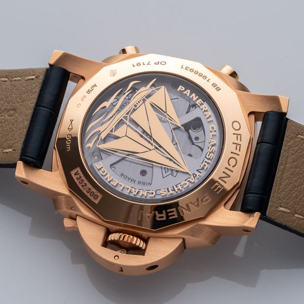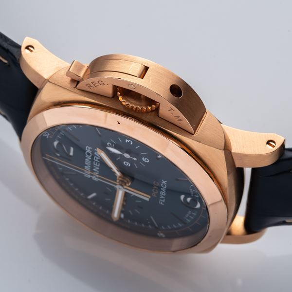Note: Quadrante bicompax sandwich, piccoli secondi ad ore nove, ore cronografiche ad ore tre. Cinturino in pelle Panerai e fibbia in oro Rosso 18kt Panerai. Vetro minerale bombato, fondello a vista, edizione limitata 500 pezzi.