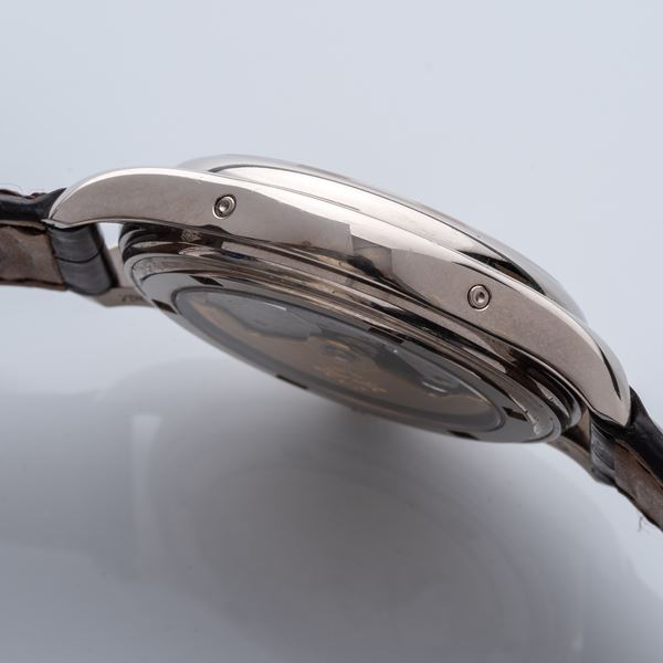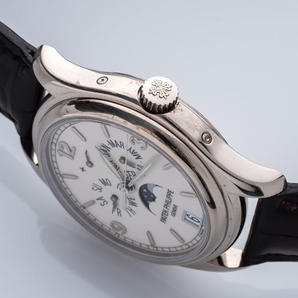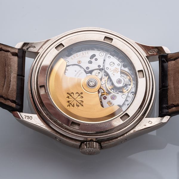 Note: Indici a bastone applicati, numeri arabi ad ore tre, nove e dodici applicati. Riserva di carica ad ore 12, datario e fasi lunari ad ore sei. Sfere a foglia luminescenti. Cinturino in pelle, deployante Patek Philippe in oro bianco 18kt.