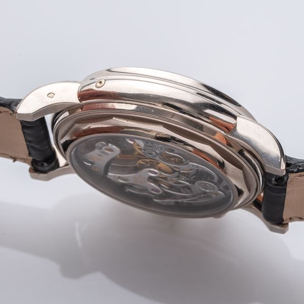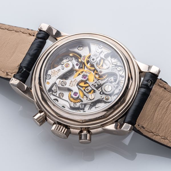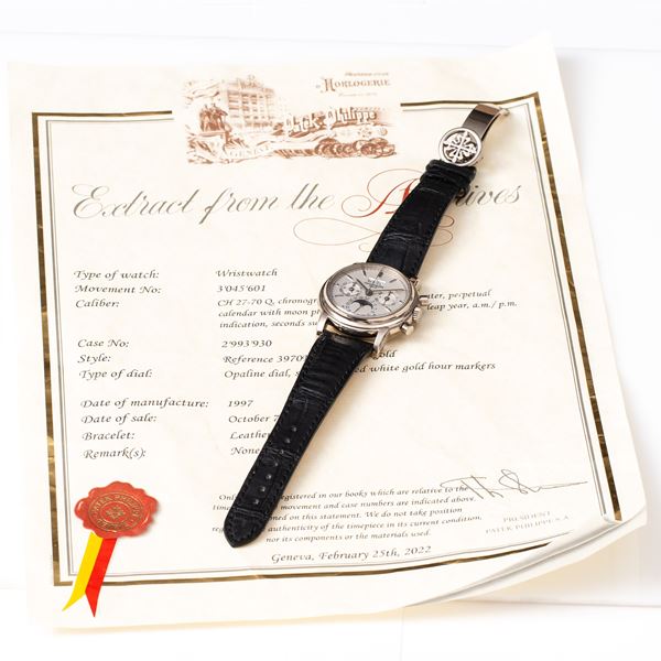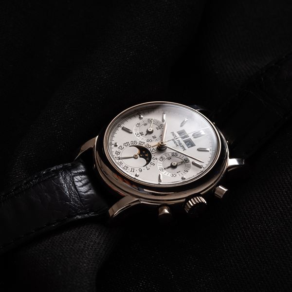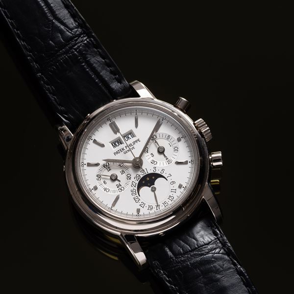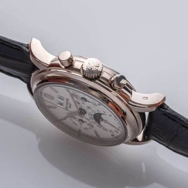Note: Cronografo in oro bianco 18kt con calendario perpetuo, fasi lunari e indicazione ventiquattro ore. Quadrante bianco con indici e sfere a bastone. Cinturino in pelle e deployante in oro bianco 18kt Patek Philippe. Vetro minerale piatto. Fondello a vista a vite. Estratto