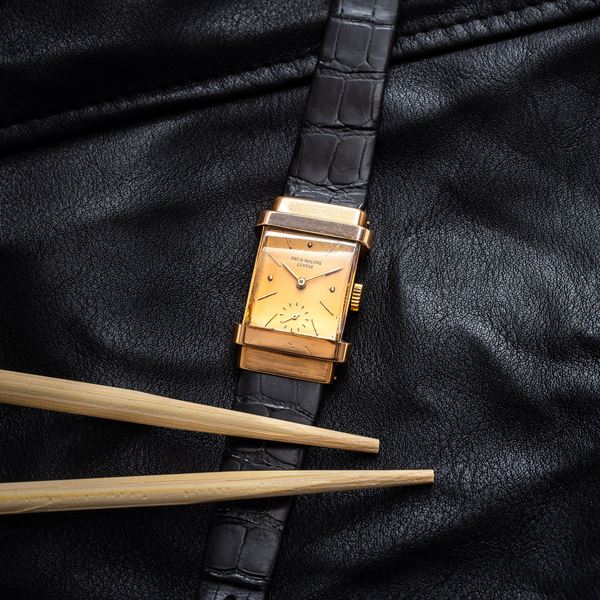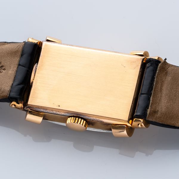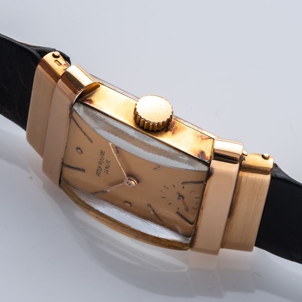 Note: Quadrante rosa salmone, piccoli secondi ad ore sei. Sfere a bastone. Vetro di forma minerale. Fibbia in oro 18kt Patek Philippe, cinturino in coccodrillo Patek Philippe.