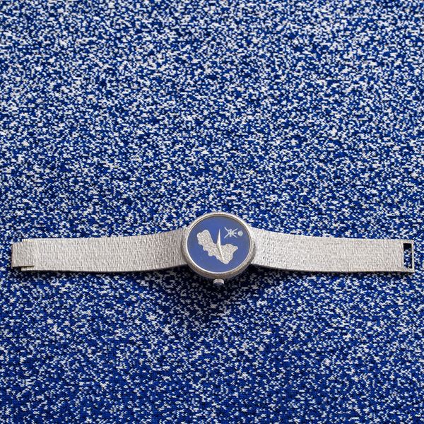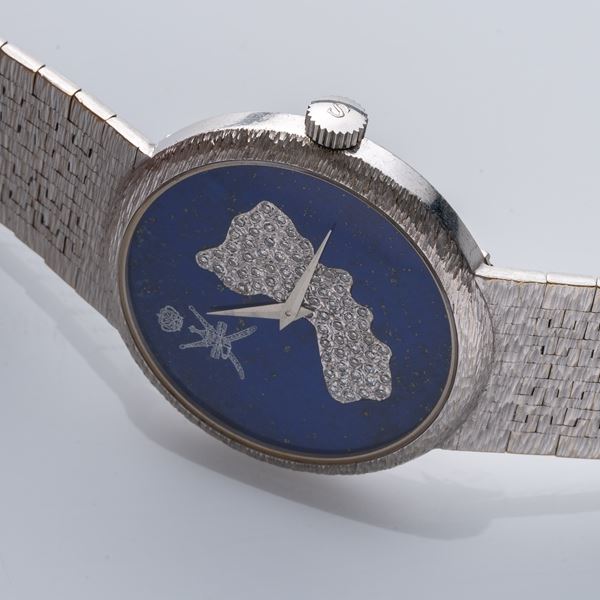 Note: Orologio con bracciale integrato di lunghezza 18 cm, cassa e bracciale in oro bianco 18kt con lavorazione a corteccia. Quadrante in pietra lapislazzuli raffigurante la mappa dello Stato dell'Oman in diamanti. Ad ore 11 logo Kanjar Oman. Sfere dauphine in oro bianco. Vetro minerale piatto. Bracciale accorciabile.