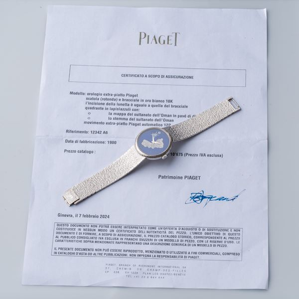 PIAGET - OROLOGIO A CARICA AUTOMATICA IN ORO BIANCO 18KT CON BRACCIALE INTEGRATO, QUADRANTE IN LAPISLAZZULI CON DISEGNO MAPPA OMAN IN DIAMANTI, LOGO OMAN AD ORE UNDICI.