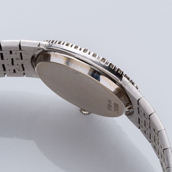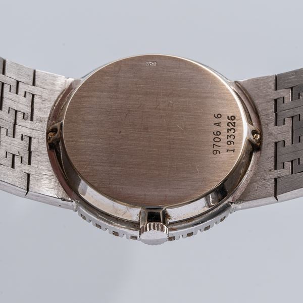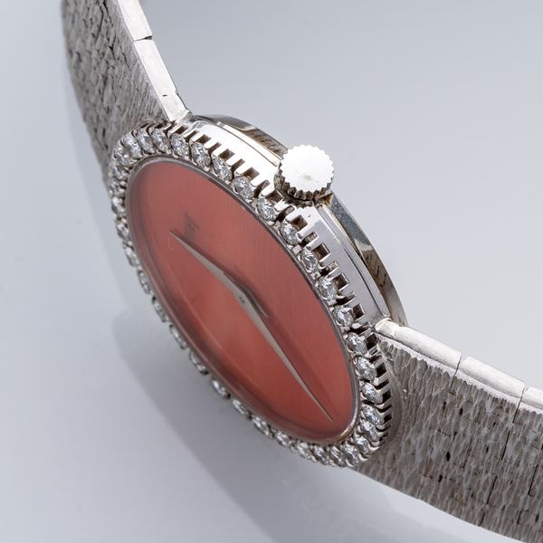 Note: Orologio in oro bianco 18kt con bracciale integrato in oro bianco 18kt di lunghezza 18.5 cm. Quadrante in corallo. Sfere dauphine in oro bianco. Ghiera in diamanti. Carica manuale. Vetro minerale piatto.