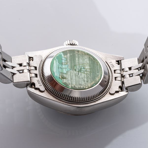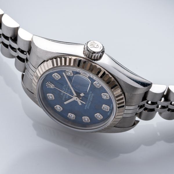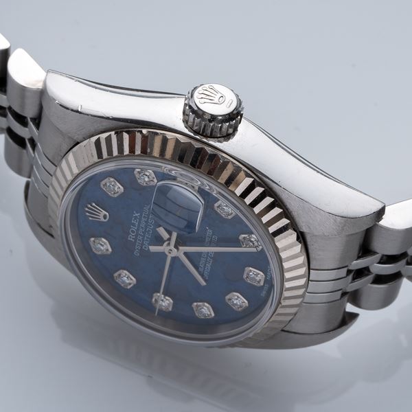 Note: Quadrante sodalite con indici in diamante. Sfere a bastone. Bracciale jubilee in acciaio. Corona e fondello a vite. Vetro zaffiro piatto.