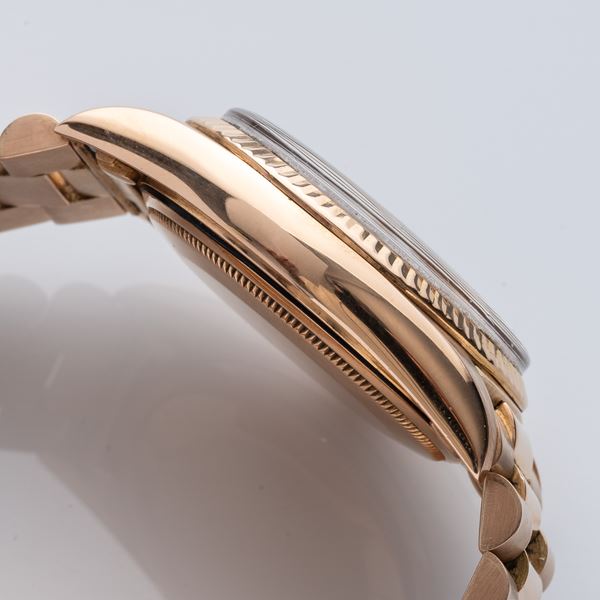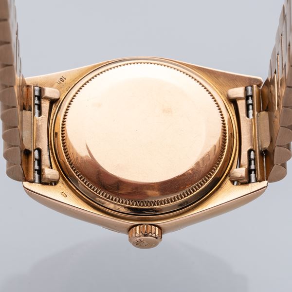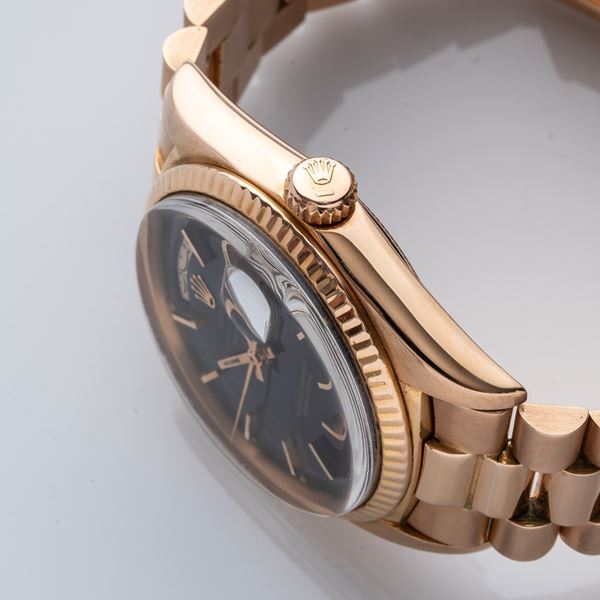 Note: Quadrante nero 'step dial' nero, indici e sfere a bastone in oro rosa. Grafiche oro. Calendario in arabo. Datario ad ore tre, giorni ad ore dodici. Cassa in oro rosa 18kt in oro rosa con corona e fondello a vite, bracciale president in oro rosa 18kt. Vetro plexi bombato.