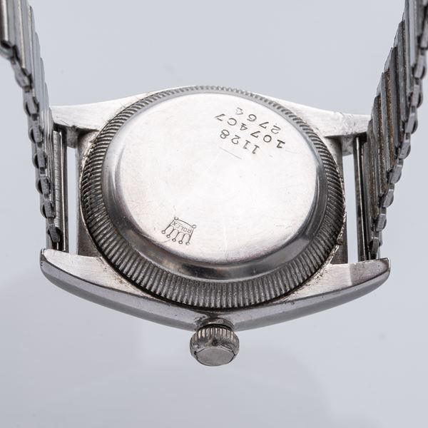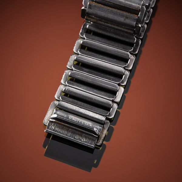 Note: Quadrante salmone con indici a bastone color oro e numeri romani ad ore tre, nove, dodici. Corona a vite, bracciale in acciaio 'bamboo' Gay Freres. Vetro plexiglass bombato, fondello a vite.