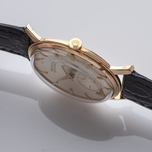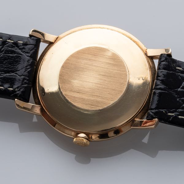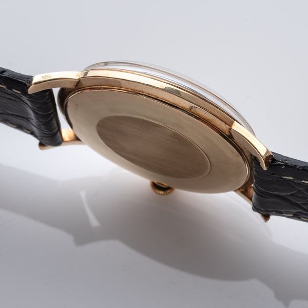 Note: Orologio in oro 9kt, indici applicati a bastone, sfere dauphine. Piccoli secondi ad ore sei.