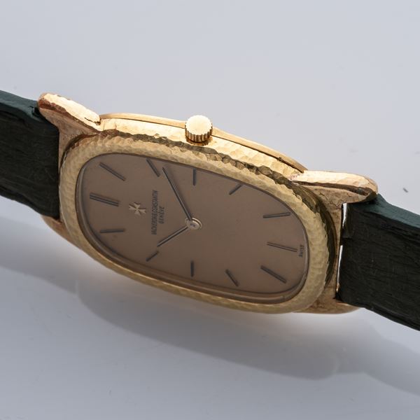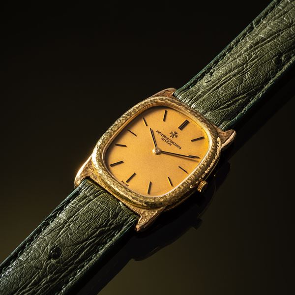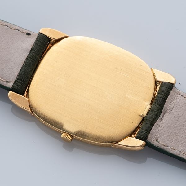 Note: Quadrante giallo, indici e sfere a bastone. Cinturino in pelle verde. Vetro minerale piatto. Cassa in oro giallo 18kt lavorata.