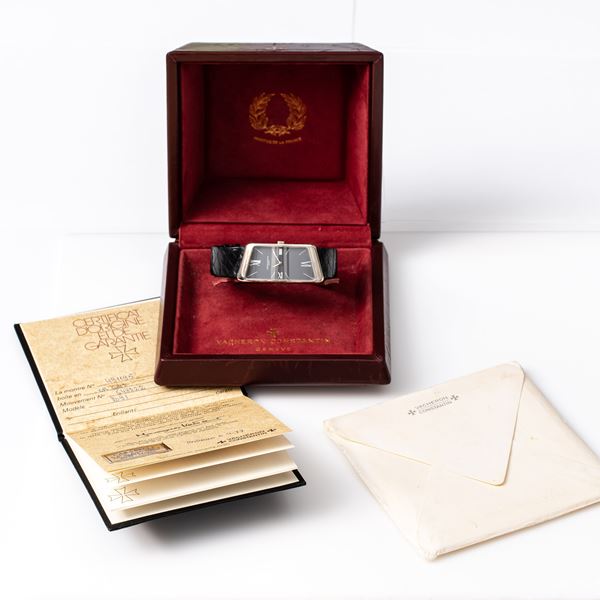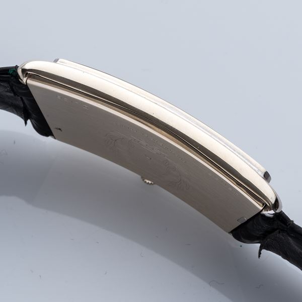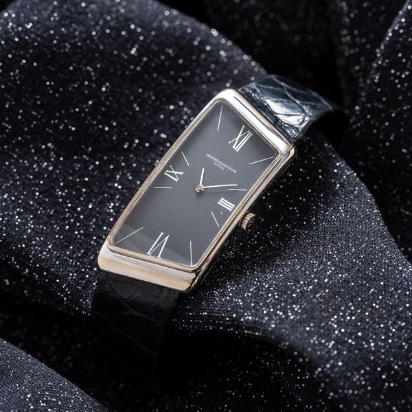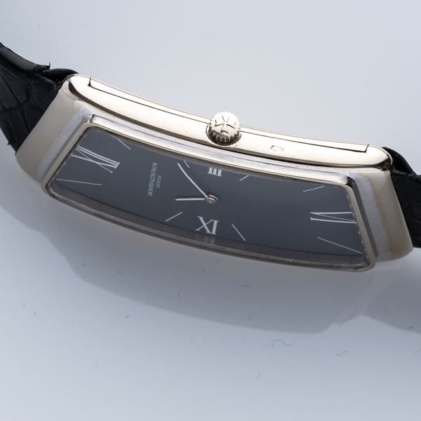 Note: Orologio con cassa asimmetrica curva in oro bianco 18kt. Quadrante grigio con indici a bastone e romani ad ore tre, sei, nove e dodici bianchi. Sfere a bastone bianche. Vetro minerale curvo. Cinturino in pelle e fibbia AW in oro bianco 18kt Vacheron Constantin.