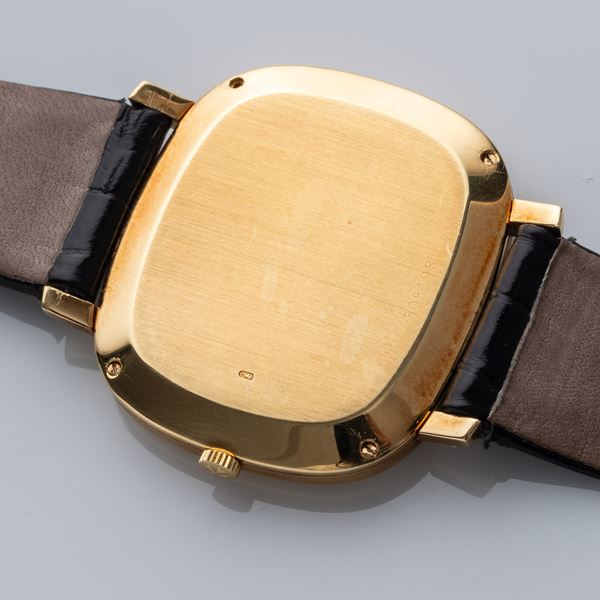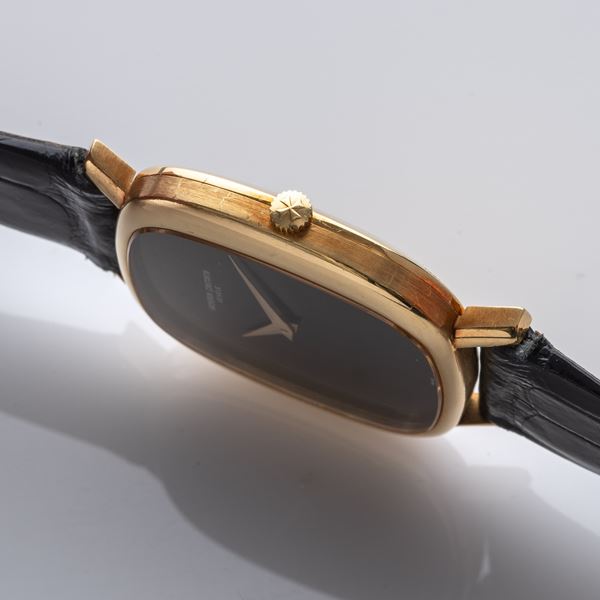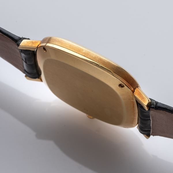 Note: Orologio con cassa di forma, quadrante in pietra onice. Vetro minerale piatto. Sfere in oro dauphine. Cinturino in pelle Vacheron Constantin, fibbia in oro 18kt AW.