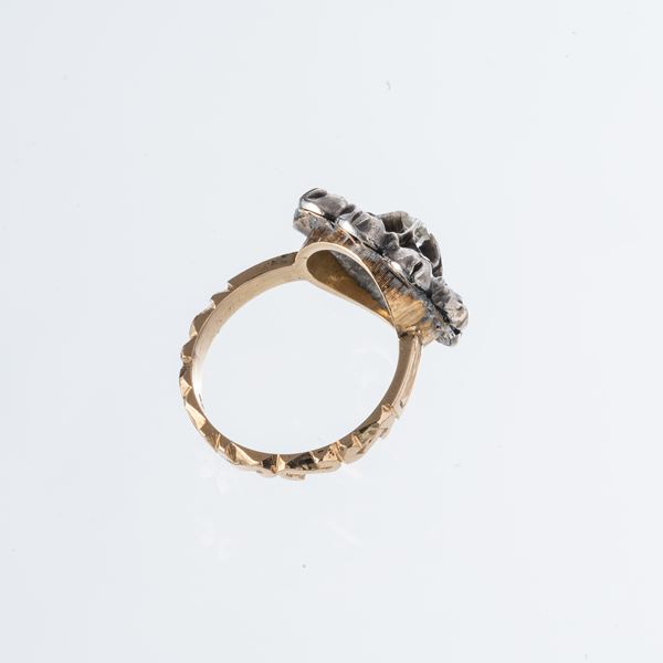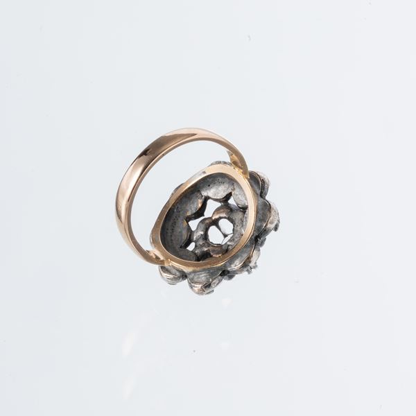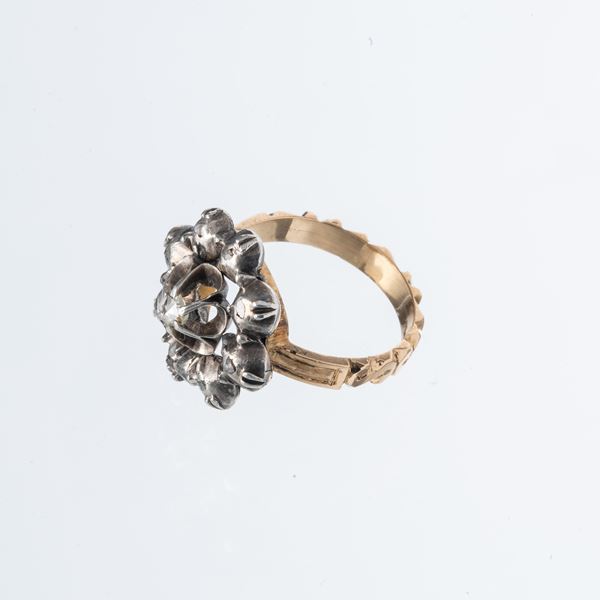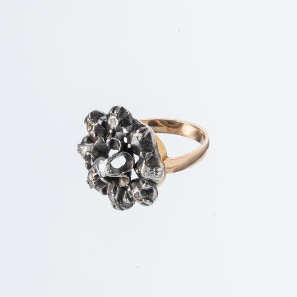 2 ANELLI IN ORO GIALLO 18 KT E ARGENTO CON ROSETTE DI DIAMANTE MONTATE A NOTTE