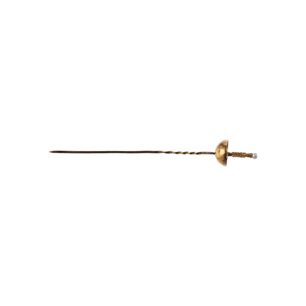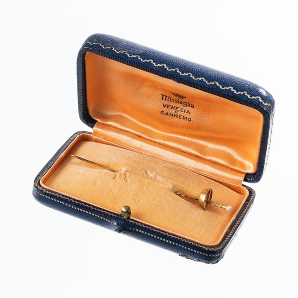 5 SPILLONI DA CRAVATTA IN ORO GIALLO 18 KT RAFFIGURANTI FIORETTO, BOTTIGLIA CHAMPAGNE, VASO, FIORE E ZOCCOLO DI CAVALLO
