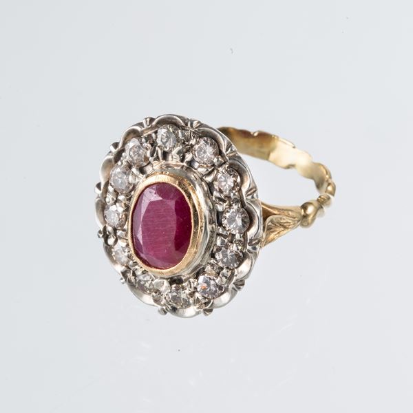 ANELLO IN ORO 18 KT CON RUBINO CON CONTORNO DI DIAMANTI
