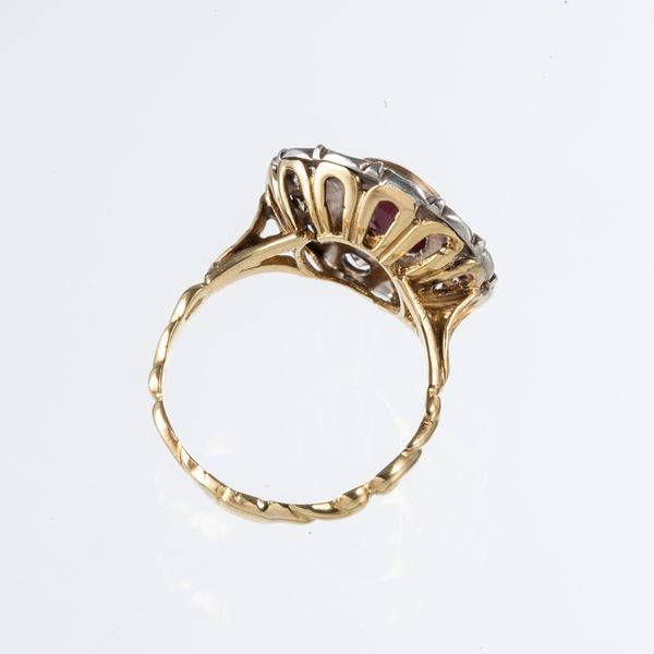 Note: Anello in oro giallo 18kt con rubino 8x10 mm con contorno di brillantini di altezza 20 mm