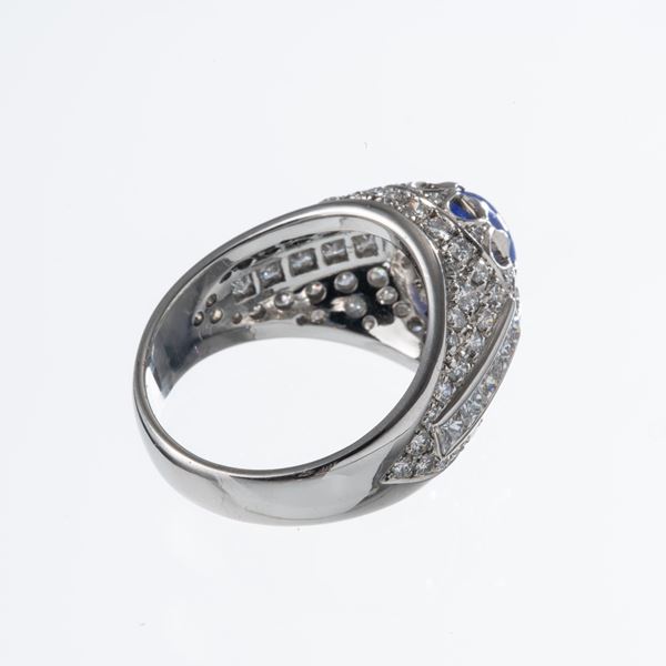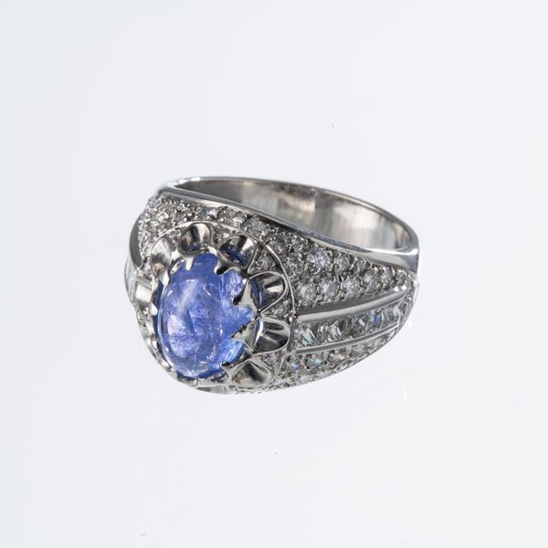 Note: Anello in oro bianco 18kt con cabochon in tanzanite e contorno di brillanti circa 1.20ct, larghezza 14.7 mm