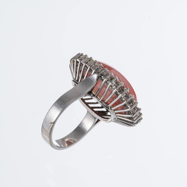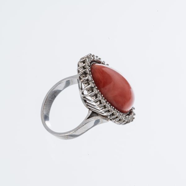 ANELLO IN ORO BIANCO 18 KT CON UN CORALLO DI NOTEVOLI DIMENSIONI CERASUOLO E CONTORNO DI DIAMANTI